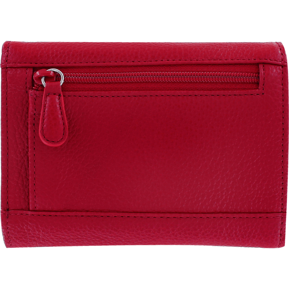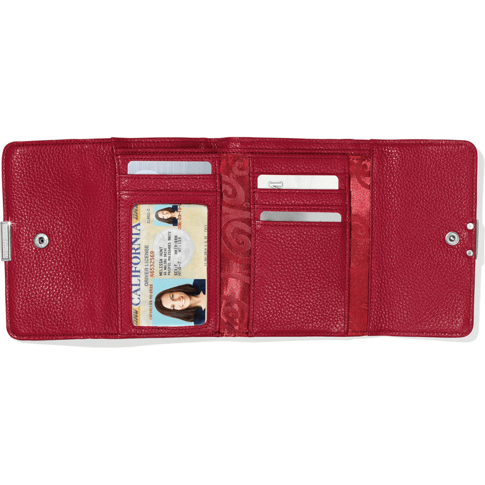 This double flap wallet keeps your belongings organized and neat in a design that is as unique as it is practical. Color: Lipstick Dimensions: Width: 5", Height: 3 3/4", Depth: 1 1/4" Weight: 0.525 lbs Credit Card Slots: 5 Interior Pockets: 9 ID Window: Yes Exterior Material: Leather Closure: Snap Exterior Pockets: 1