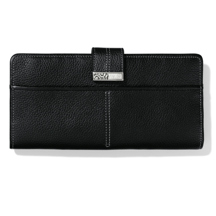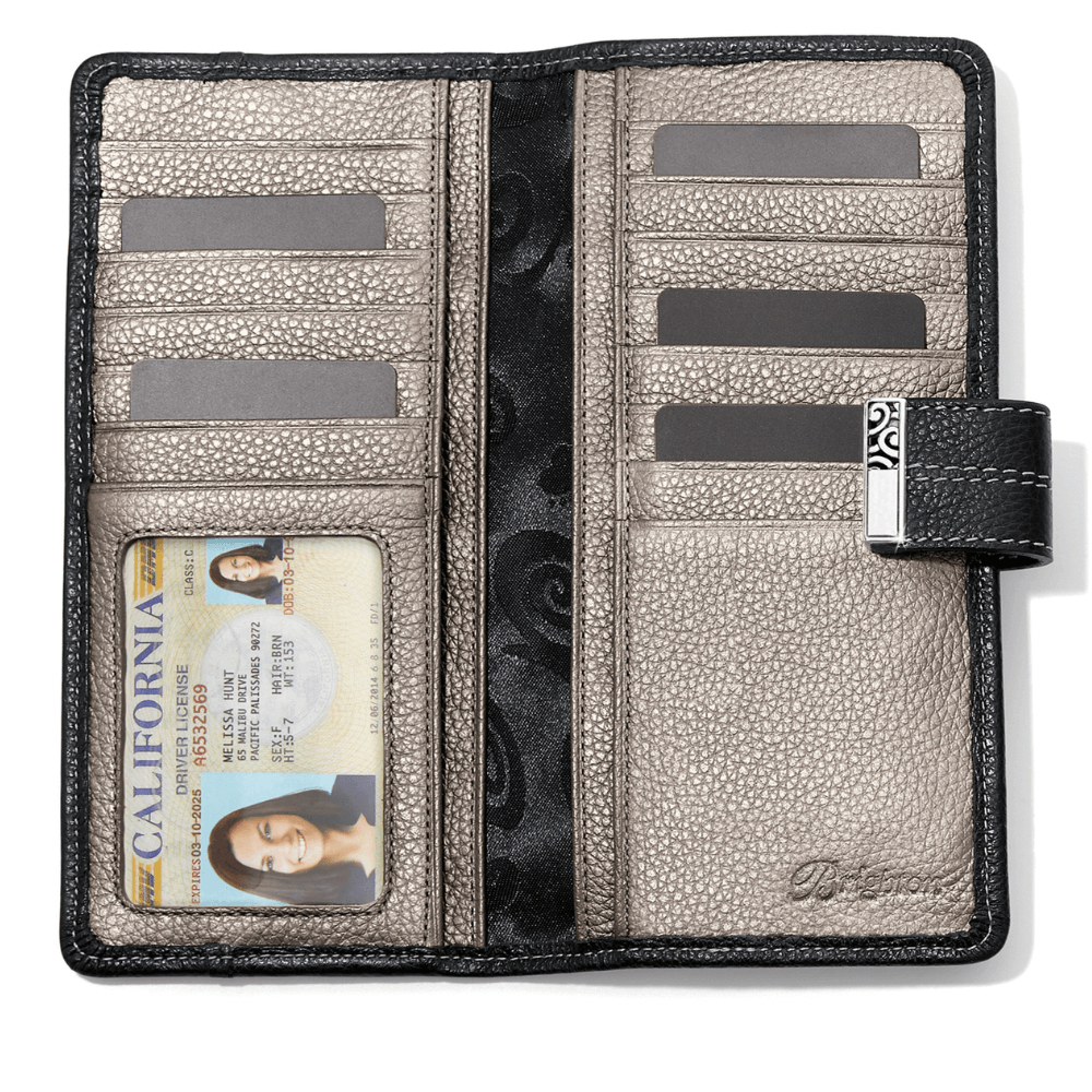 Color: Black Dimensions: Width: 7 1/2", Height: 3 3/4", Depth: 1 1/4" Weight: 0.42 lbs Credit Card Slots: 14 Interior Pockets: 4 Exterior Material: Leather Exterior Pockets: 3 Closure: Snap Features: ID window