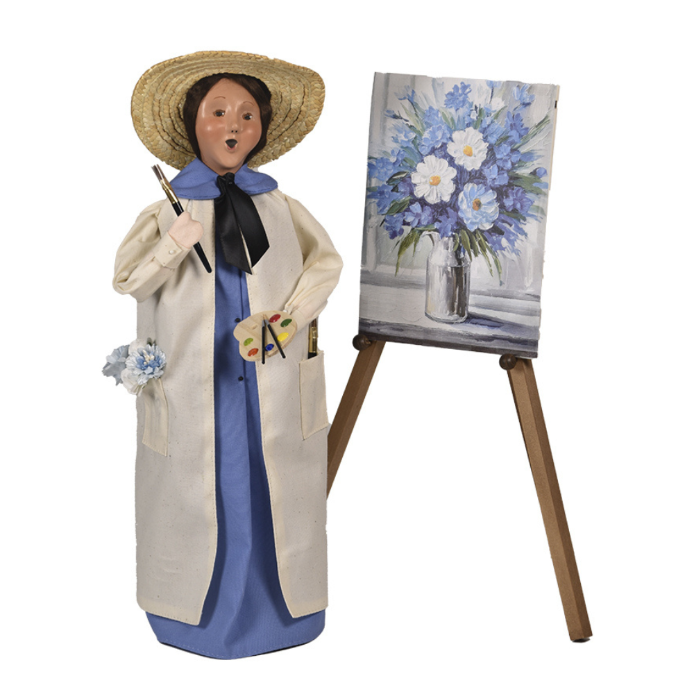 Surrounded by soft petals and gentle hues, this Artist captures nature’s fleeting beauty with every brushstroke. Dressed in a painter’s smock over her flowing blue button up, this devoted artist stands beside her easel, mid-creation—a vase of blue and white blossoms blooming to life on her canvas. Tucked into her pocket are fresh brushes and the very flowers that stirred her imagination, a reminder that art often begins with what we stop to admire.