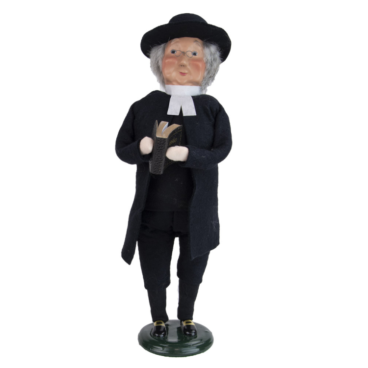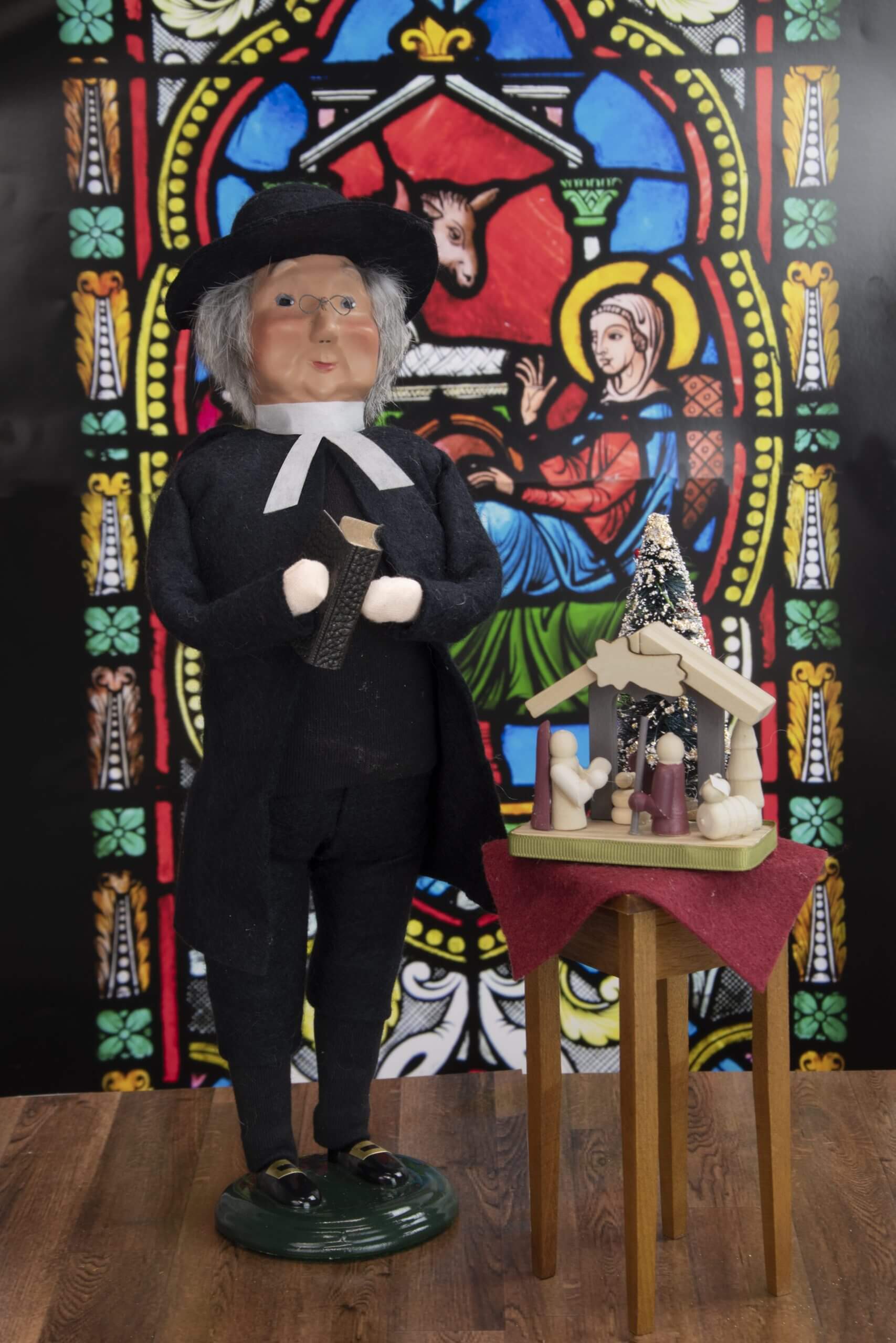 The Country Parson, with Bible in hand and Nativity on display, prepares his candlelight service for Christmas Eve.