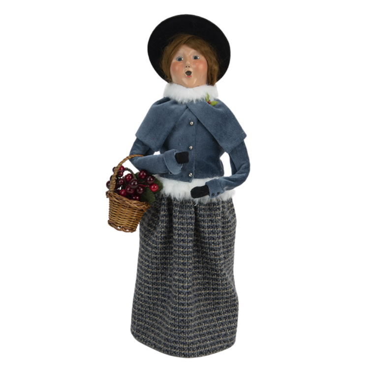 Byers Choice - Davis Family Woman Transport yourself to a bygone era of yuletide cheer with the Davis family dressed in their finest holiday attire, sharing the charm of a Dickensian Christmas. This ensemble embodies the warmth and merriment of Christmas while paying homage to the significance of cranberries during the season. The mother cradles a basket of glistening berries as a nod to the many cranberry inspired dishes she’ll soon prepare. The father showcases a holly cranberry wreath which is highlighted by the berries vibrant red hue, a perfect blend of holiday color. At the heart of the scene, the young boy adds a melodious dimension to their caroling with a French horn. Size: 13 Inches