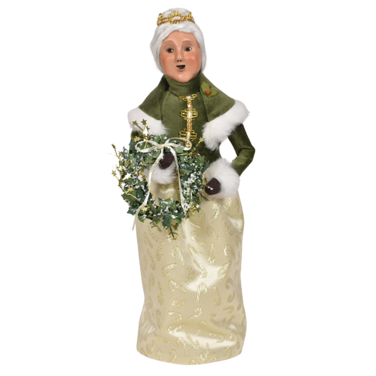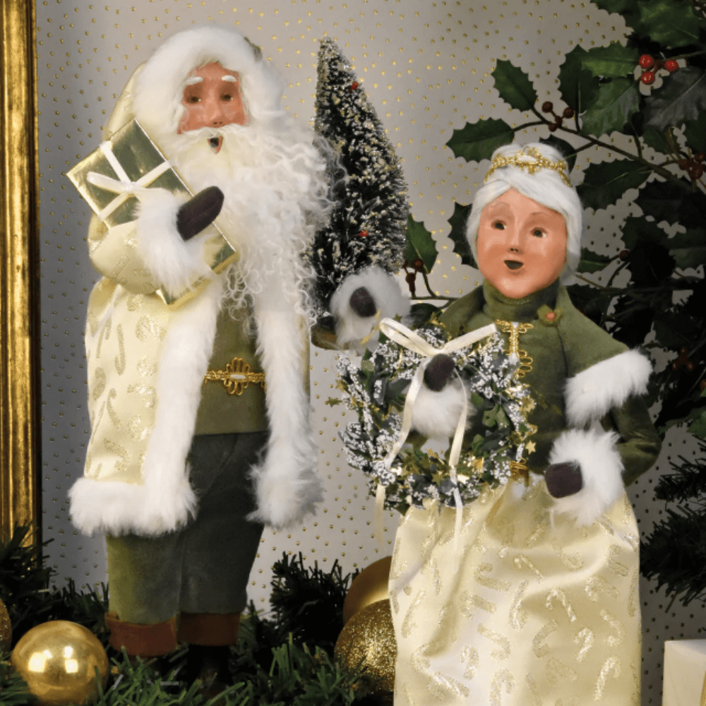 With a bright, glittering wreath held gently in her hands, Gold Sparkle Mrs. Claus radiates warmth and festive joy. Her rich green and gold palette complements Santa beautifully, evoking the glow of candlelight, decorated trees, and cherished holiday traditions shared in homes filled with love and celebration.