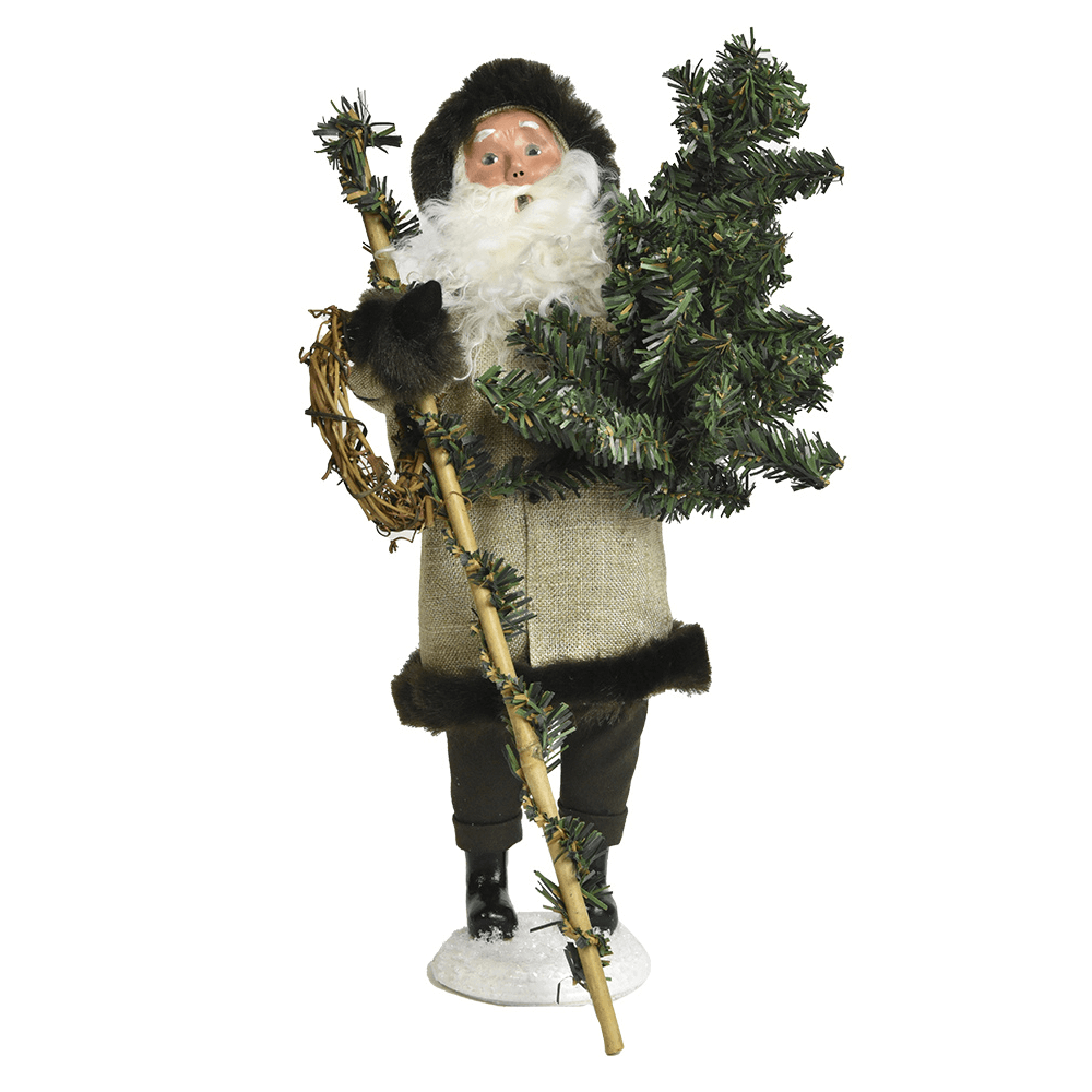 Rustic Santa enjoys the beauty of a woodland Christmas. Dressed in a burlap coat with luxurious brown fur trim, this rugged Santa traverses the snowy North Pole. A freshly chopped tree in hand brings the magic of the forest into your home.