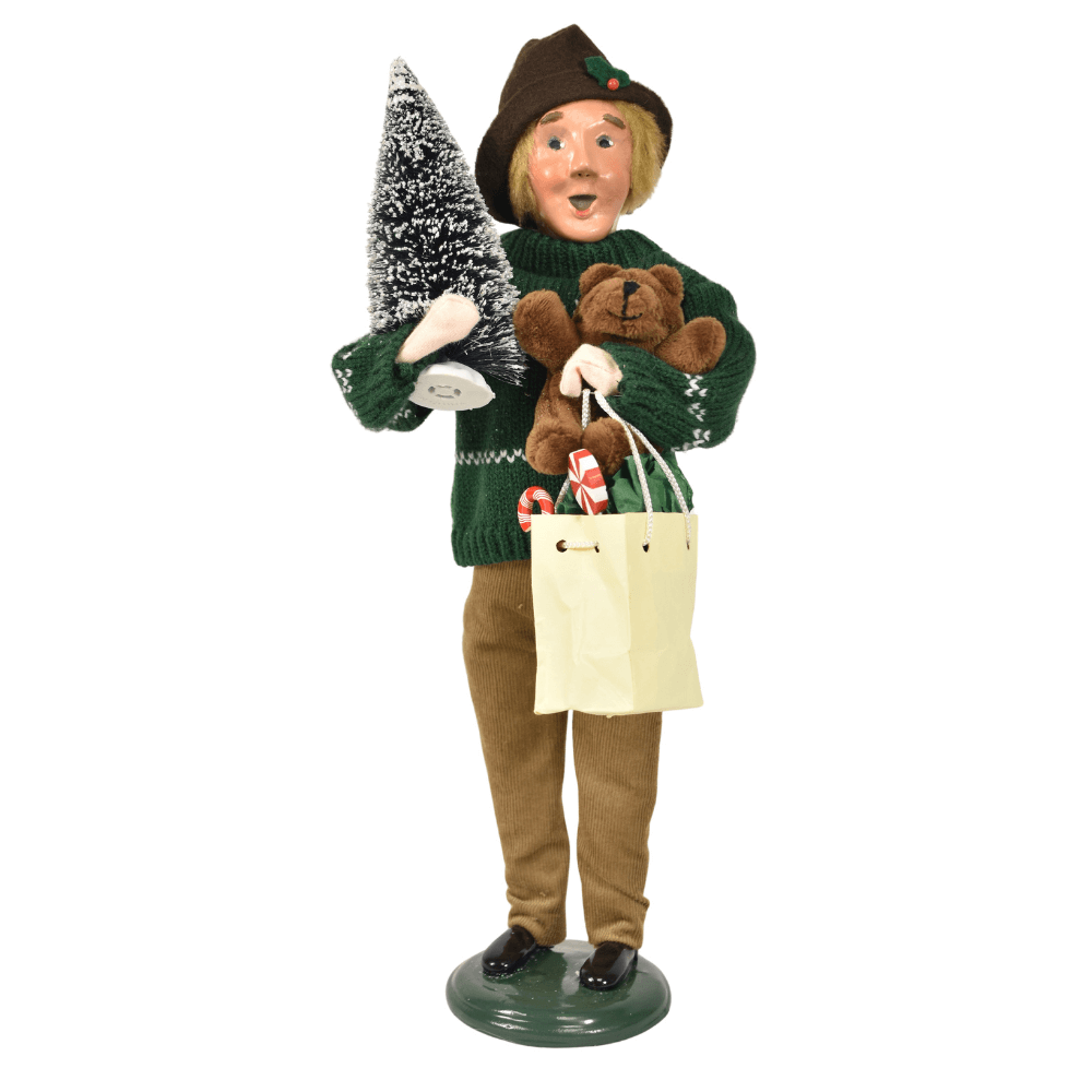 This handcrafted Byers’ Choice Shopping Man Caroler is festive and perfect for Christmas decorating. Dressed in a cozy winter sweater and carrying bags and boxes from a busy day out, he brings the warmth of holiday giving to seasonal displays.