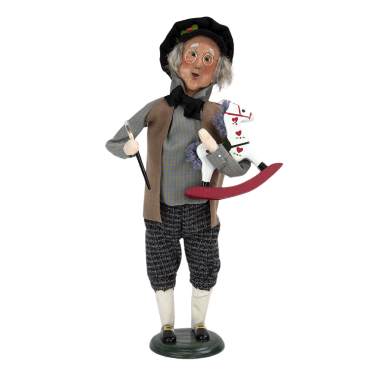 Santa’s elves couldn’t do it any better. This happy gentleman could easily be a helping hand to Santa’s long toy wish list. Adorable rocking horse and brush add a terrific accent to this new piece to build on to your Byers Choice Caroler collection.