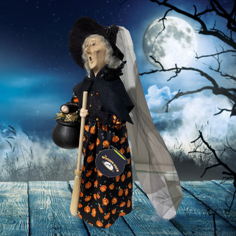 Joyce Byers and Jane Berger have once again collaborated on designing a bewitching Halloween Caroler produced exclusively for the Wooden Duck. Introducing "Winifred”, she is ready to cast a little mischief and a lot of charm this Halloween season. With a black crow perched on her shoulder, “Winifred” swoops down from the twilight sky and wanders the streets below in search of unsuspecting victims. Can you hear the ghosts and goblins darting about as they admire her black gown accented with orange pumpkins, her black shawl covering her shriveled arms, and her lengthy veil? The poisonous black spider atop her crushed hat is awaiting a perfect location to spin her web; could it be your home. Halloween may be months away, but don’t hesitate as "Winifred" is a limited edition and of limited quantities! Comes with a caldron hangtag.