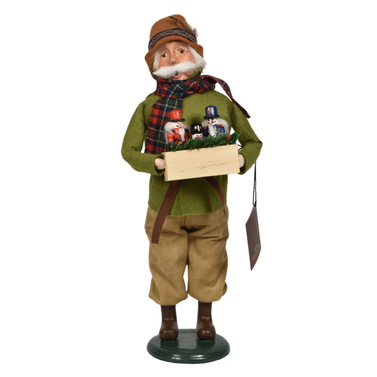 This handcrafted Byers’ Choice Cry Selling Nutcrackers Caroler is festive and perfect for the Christmas holiday season. Part of the beloved Cries of London Collection, he brings the charm of old-world street vendors to your holiday display. Offering hand crafted Nutcrackers piled high on his table ready for families to take home for Christmas decorating. In historic London, street vendors known as “cries” would shout or sing catchy rhymes to sell their wares like “Hot cross buns!” or “Fresh strawberries!” This cheerful Caroler keeps that tradition alive, dressed in his holiday finest, spreading the joy of Christmas Nutcrackers with every melodic cry.