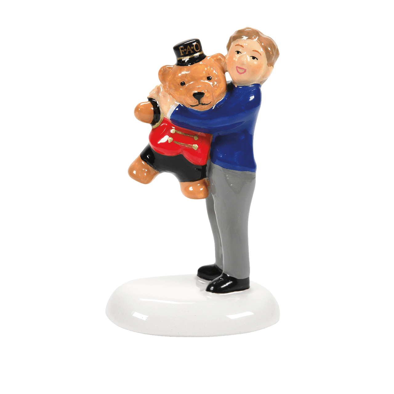 This happy youngster hugs a new friend, an FAO Schwarz teddy bear wearing the signature toy soldier uniform. Introduction: January 2022