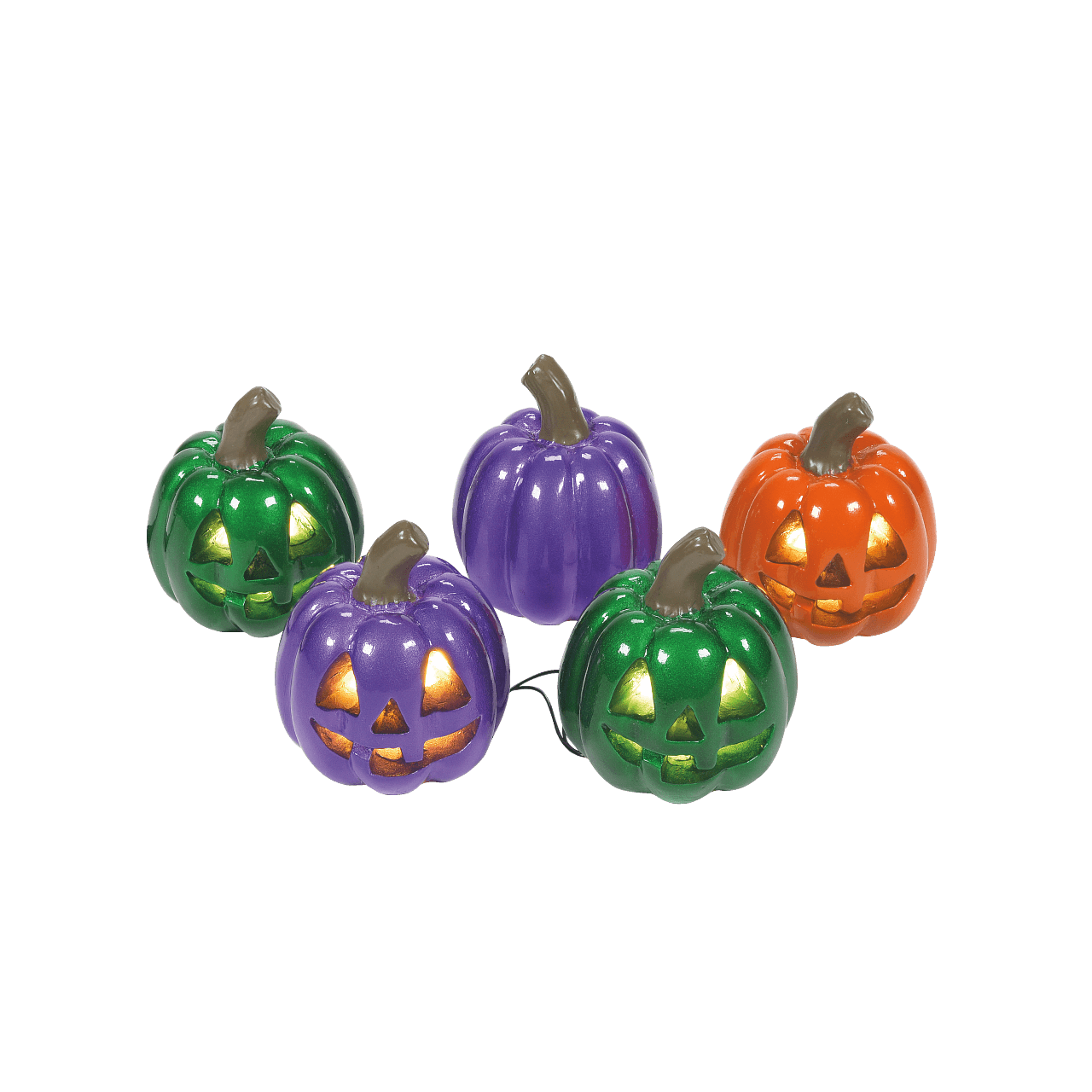 Glammed up for the holiday, these six shiny pumpkins reflect their LED lights as they swing on an electrical wire. The string is powered by a battery box which is included or it can be converted to AC/DC adapter (#4035316 or 56.55026).