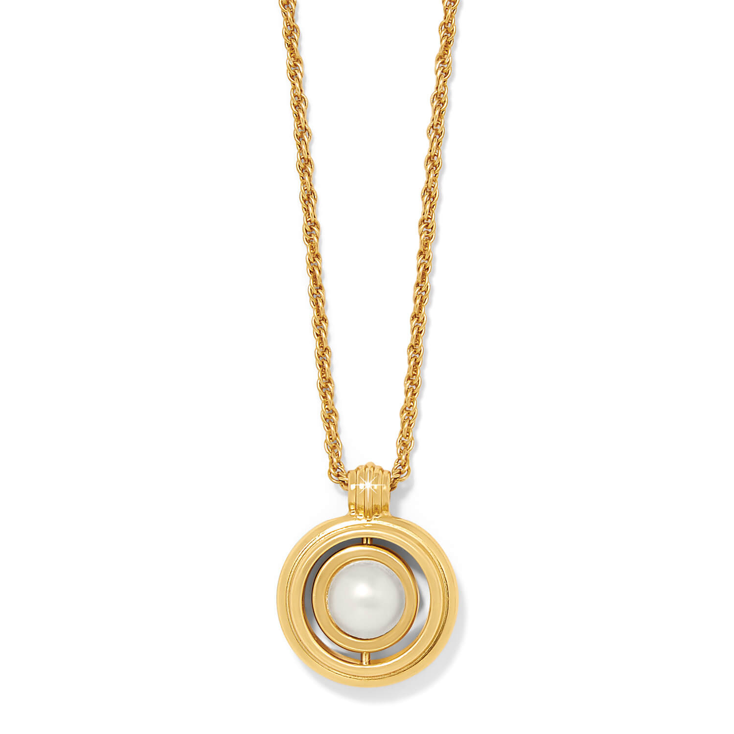 This Art Deco-inspired necklace has simplicity, symmetry and a repetition of linear elements. A sculptural masterpiece. Collection: Ferrara Color: Gold-Pearl Closure: Lobster Claw Length: 16" - 18" Adjustable Features: Swivel glass pearl Pendant Drop: 3/4" Material: Fine quality glass pearl Finish: Gold plated
