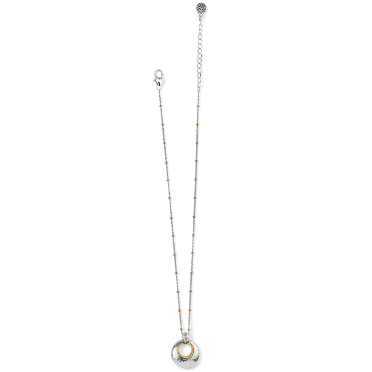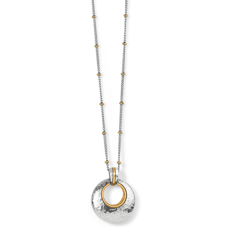 This pendant necklace with softly hammered details and golden accents is modern art-to-wear – breathtaking from every perspective. Collection: Ferrara Color: Silver-Gold Closure: Lobster Claw Length: 16" - 18" Adjustable Pendant Drop: 1" Finish: Two Tone