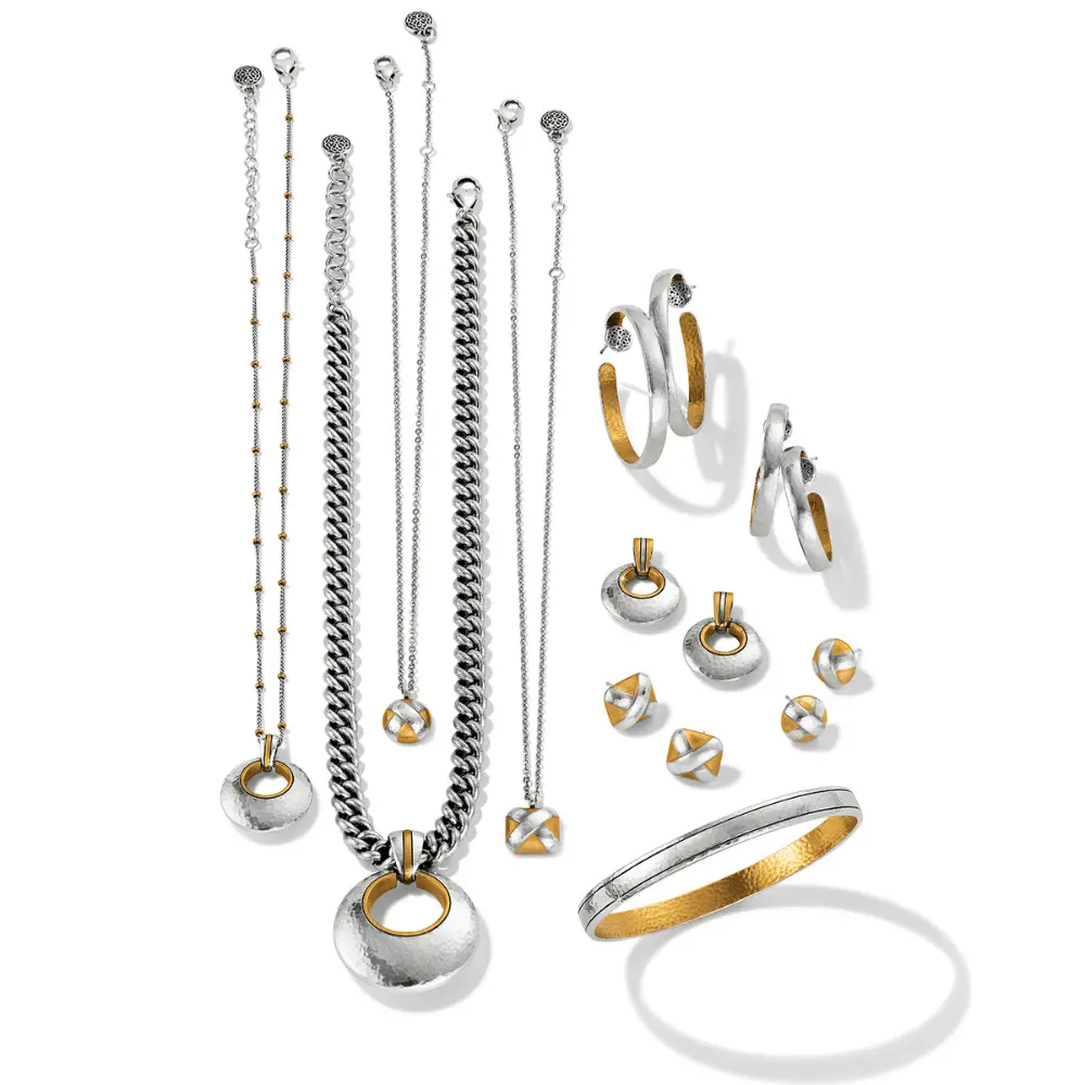 Collection: Ferrara Color: Silver-Gold Type: Post with flat disc back Width: 5/8" Drop: 3/4" Finish: Two Tone Product #: JA9266