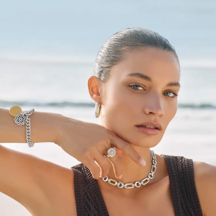Collection: Ferrara Color: Silver-Gold Closure: Lobster Claw Length: 15" - 18" Adjustable Material: Hammered Finish: Two tone Product #: JM7532