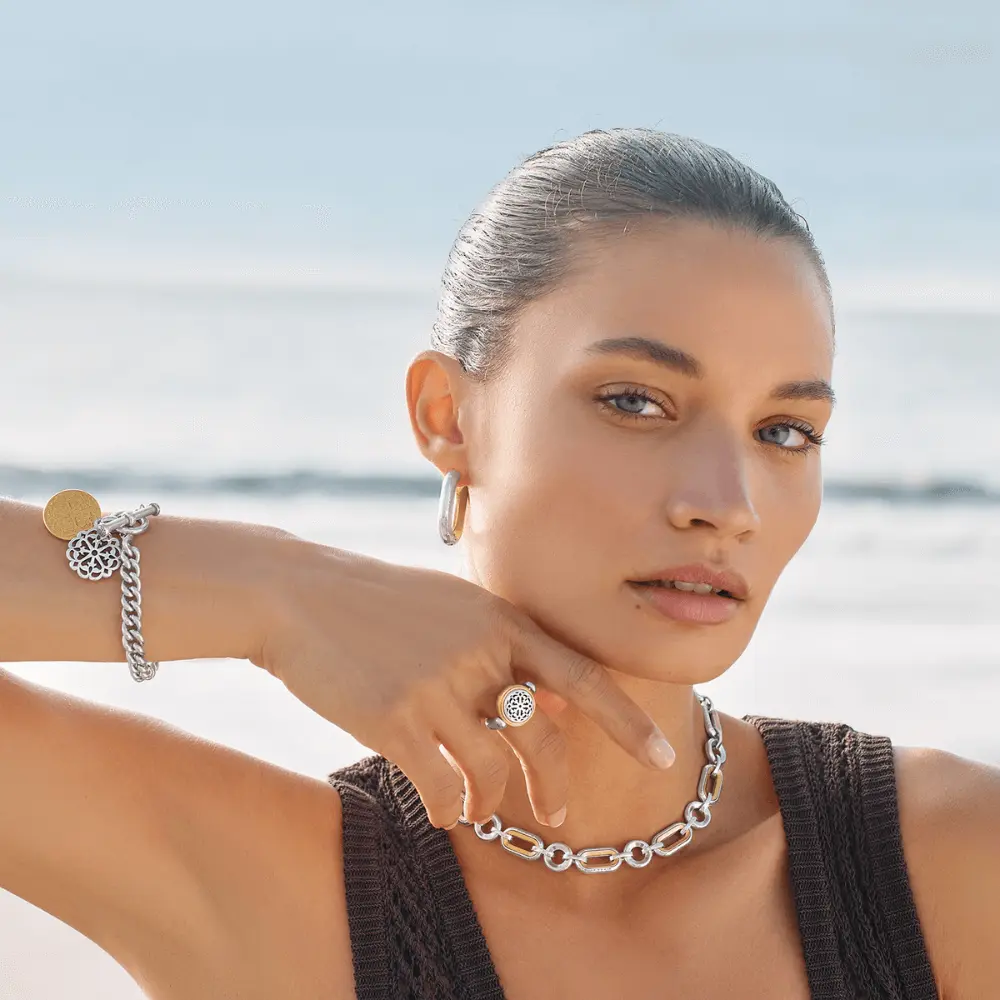 Casted and sculpted rectangular and round links give this necklace an elevated look, and the two-tone silver and gold makes it ultra-versatile. The links are Venetian Renaissance-inspired, featuring labor-intensive hand-painted and hand-hammered techniques.