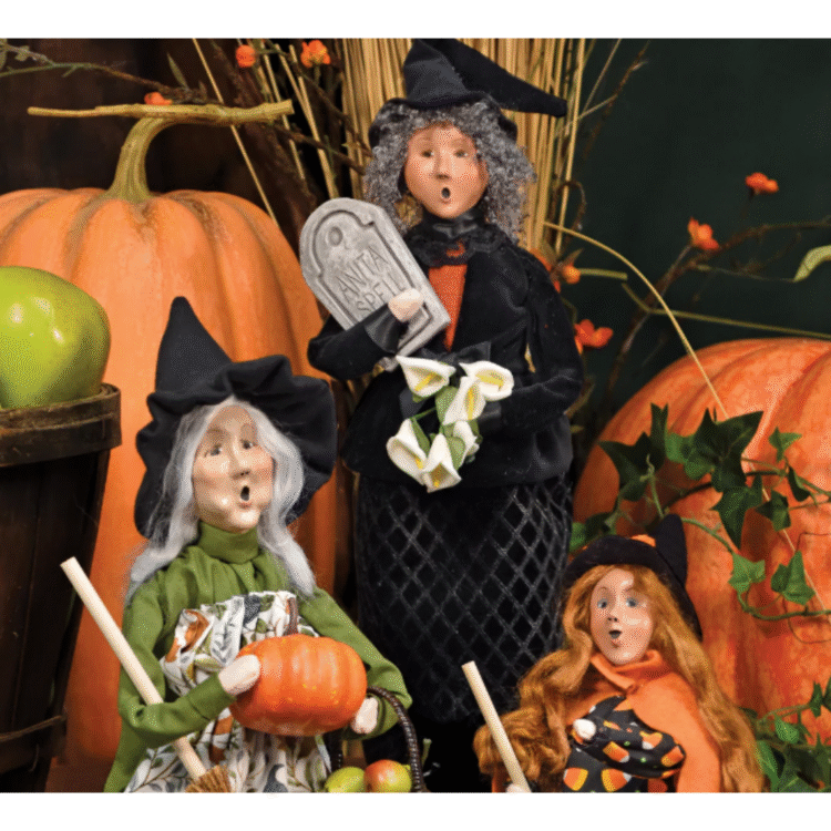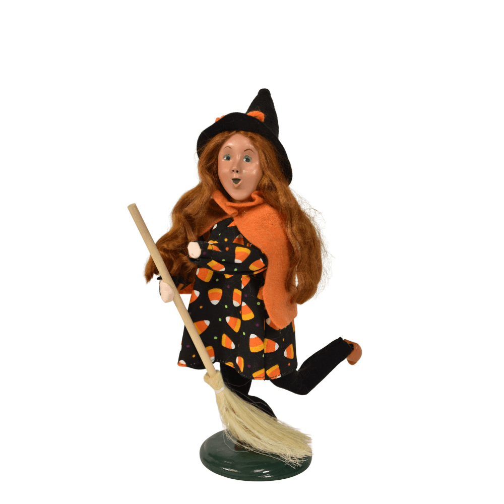 This handcrafted Byers’ Choice Girl Witch On Broom Caroler is festive and perfect for Halloween decorating. With her broom in hand and one foot lifted as if ready to take flight, she brings youthful magic and playful motion to seasonal displays. With long red hair flowing and an orange cape billowing behind her, this spirited young witch is caught just before liftoff. Her candy corn patterned dress adds a sweet seasonal touch, capturing the excitement, imagination, and lighthearted fun of Halloween where broomsticks soar, spells sparkle, and adventure waits just above the ground. Ships June 1