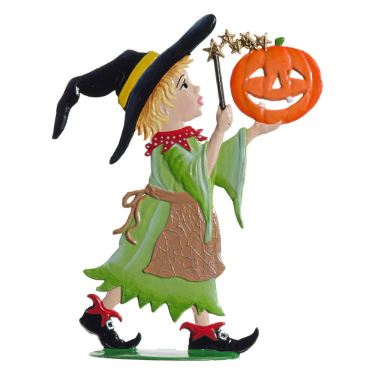 Halloween Magic by Wilhelm Schweizer. The piece is hand cast, hand painted, imported pewter from Germany. Discover the magic of the scariest night of the year with our unique pewter figure. Ideal for lovers of mystical worlds, this adorable girl with a charming magic wand and symbolic pumpkin brings a touch of magic to any collection. Colors may vary from the image shown since each piece is individually hand painted. Gift box included. Dimensions: 2.5”W x 3 1/4”H