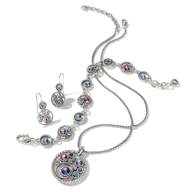 Like a cluster of stars shown through a telescope, the clusters of fine quality crystals on these earrings will beguile you. Lavender and aqua fine quality crystals twinkle like the night sky--breathtaking! Collection: Halo Color: Silver-Tanzanite Type: French Wire Width: 1/2" Drop: 1" Material: Fine quality crystal Finish: Silver plated
