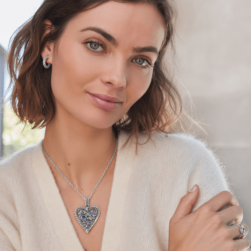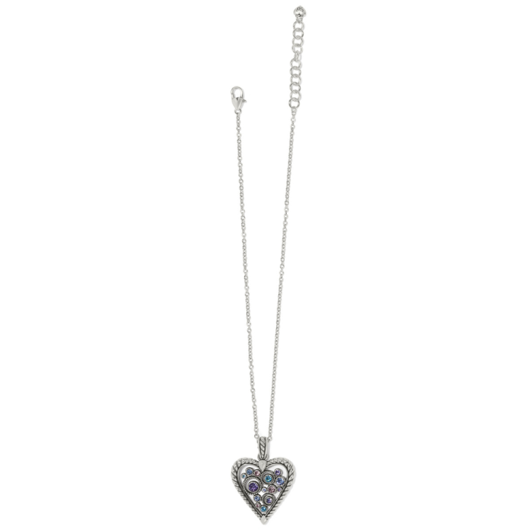 Bursting with brilliance and showered with the beautifully wearable blues and purples of the horizon, this necklace with hand-set fine European crystals was inspired by stars in the night sky. Bold roping detail frames the heart and the thickness of the roping varies to give it the look of a handmade creation. Collection: Halo Color: Silver-Multi Closure: Lobster Claw Length: 16" - 18" Adjustable Pendant Drop: 1 1/4" Material: Fine quality crystals Finish: Silver plated