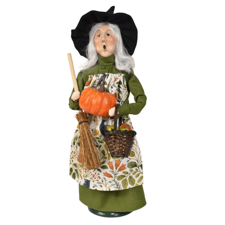 This handcrafted Byers’ Choice Harvest Witch Caroler is festive and perfect for fall and Halloween decorating. Dressed in a rich green gown with an autumn-themed apron, she brings a cozy harvest-season charm to seasonal displays. With a pumpkin tucked close, a broom at her side, and a basket of green pears gathered from the orchard, this Harvest Witch celebrates the abundance of the season. She captures the gentle, whimsical side of autumn magic where falling leaves, gathered harvests, and a touch of witchy spirit come together to mark the turning of the year. Available June 1