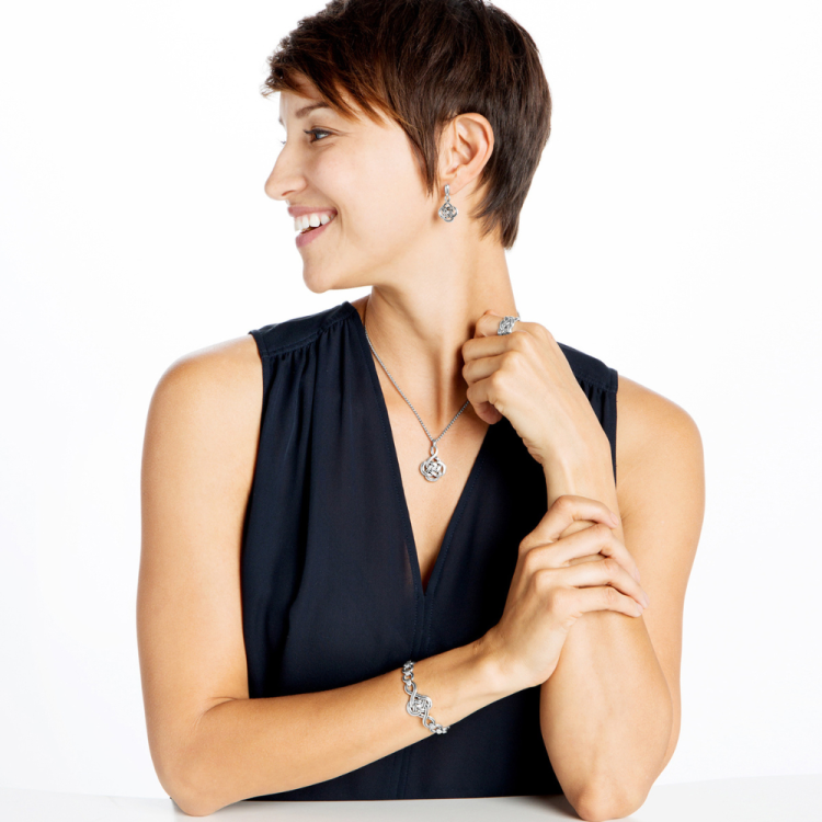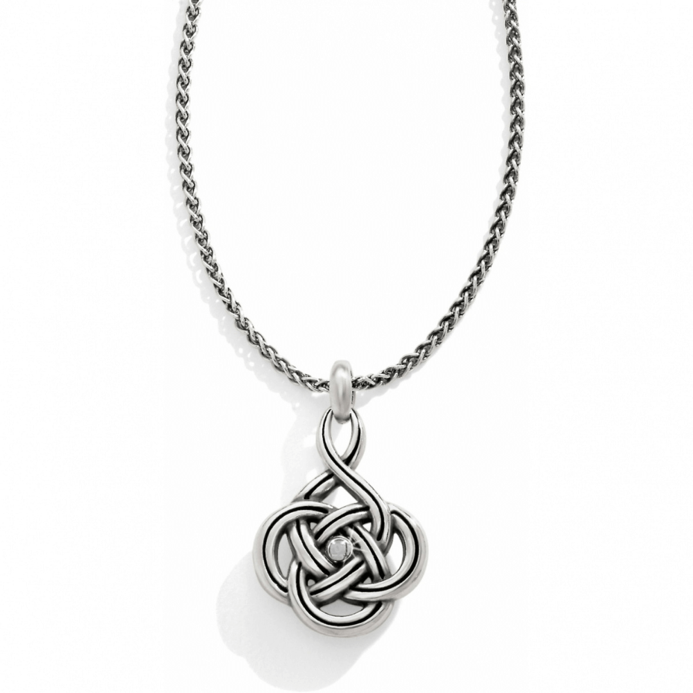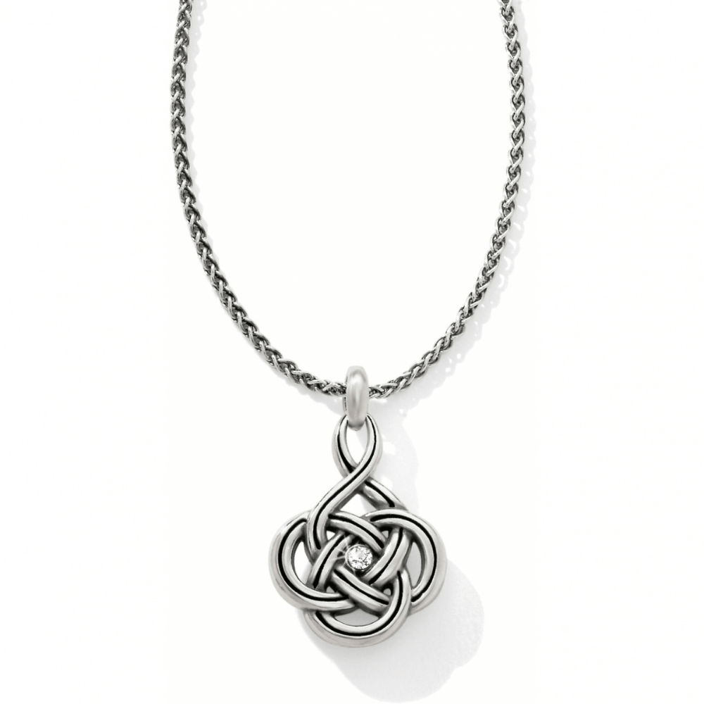 Recalling Celtic motifs, the interlocking knot on this silver necklace signifies love and life. Classic and everyday wearable. Closure: Lobster Claw Finish: Silver plated