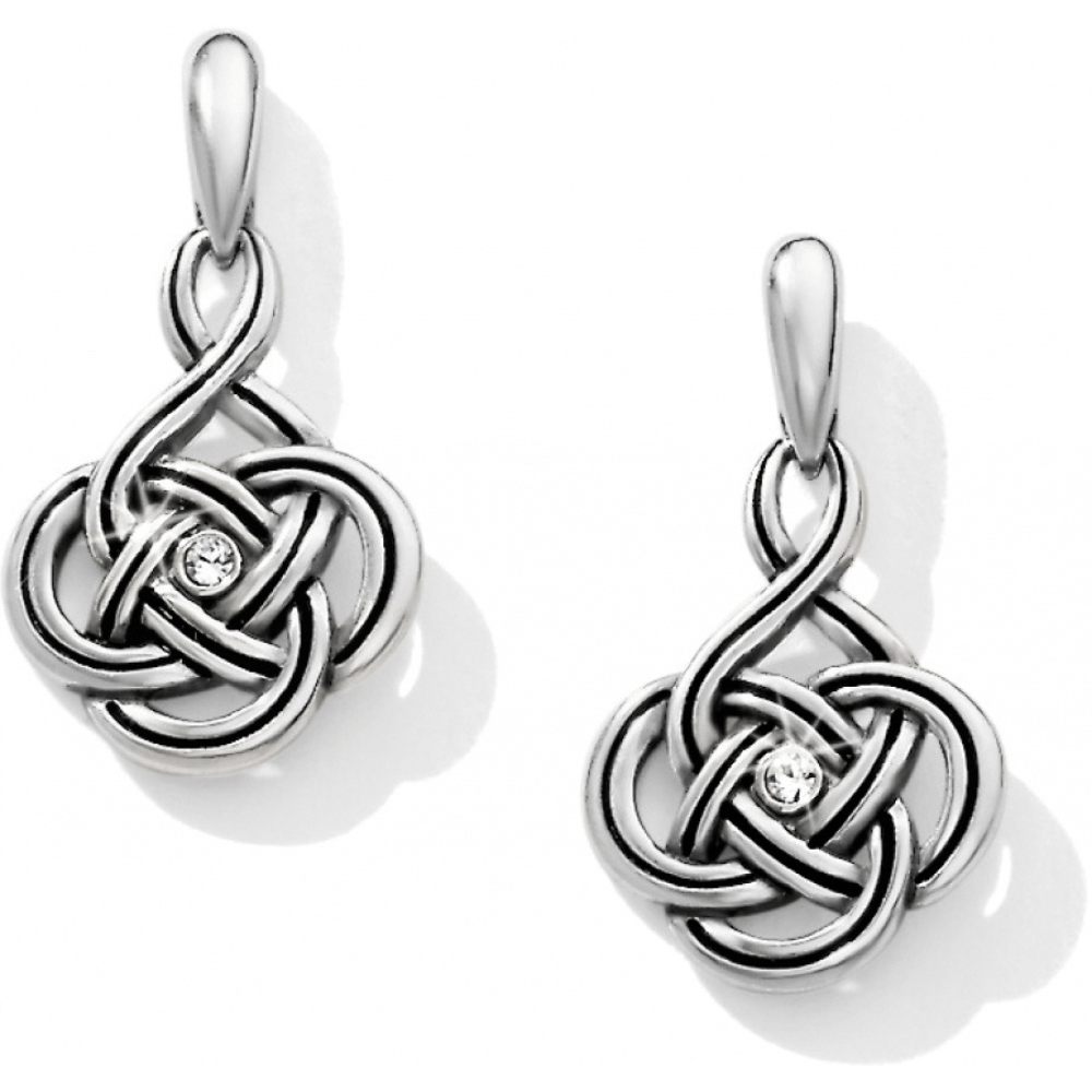 Recalling Celtic motifs, the interlocking knot on these silver earrings signify love and life. Classic and everyday wearable. Type: Post with flat disc back Finish: Silver plated