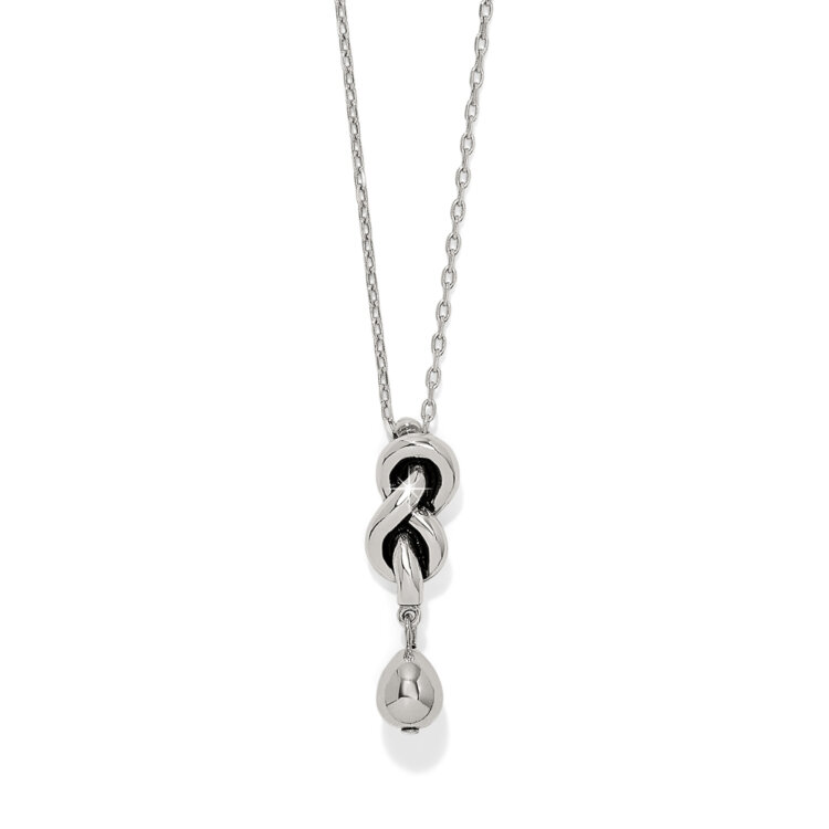 This clean, elegant design embraces modern minimalism, while showcasing intricate craftsmanship. Ultimately, knots remind us of the intricate ties that weave together our experiences and relationships. The north/south knot with a silver drop complements anything you wear. Collection: Interlok Color: Silver Closure: Lobster Claw Finish: Silver plated