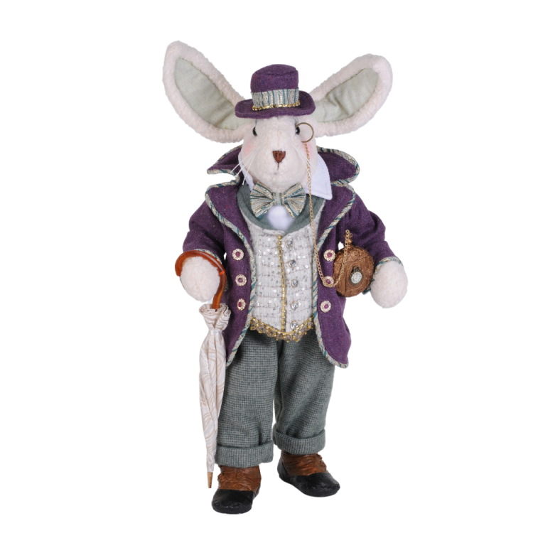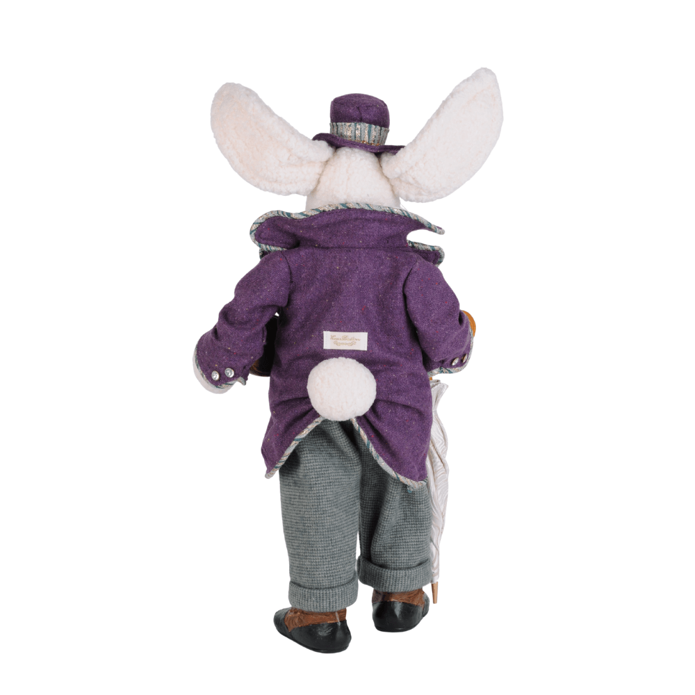 Emerson Bunny is a heartwarming addition to your spring collection. With this collectible's soft-fluffy exterior, elaborate Victorian attire styled with a violet colored coast trimmed in rhinestones and jewels, gingham wool slacks and handsomely molded shoes, and Victorian feel; he's chalked full of personality and will add character and style to any home.
