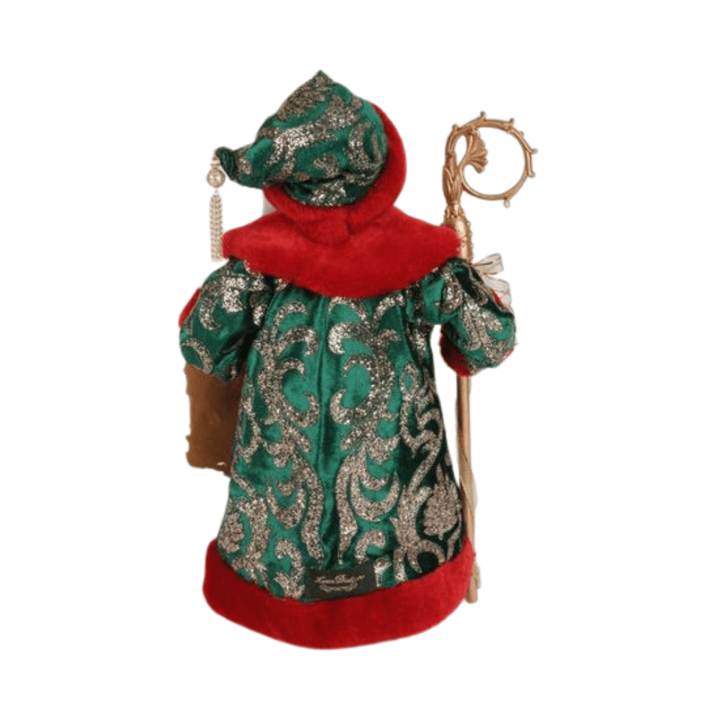 ring elegance and spiritual grace to your holiday display with our Evergreen and Crimson Santa Figurine, a stunning tribute to the true meaning of Christmas. This majestic Santa stands tall in an opulent ensemble of emerald green, shimmering gold, and rich red velvet, adorned with intricate sequins, brocade detailing, and jeweled embellishments. In one hand, Santa carries an ornate golden staff wrapped in festive ribbon and holly accents, symbolizing his guiding presence. In the other, he gently holds a golden frame featuring an inspirational message: “Jesus... the miracle of Christmas. In Him we find hope, love, and eternal life. We believe.” Elevate your seasonal collection with this noble and meaningful Santa, a beautiful blend of tradition, reverence, and festive charm.