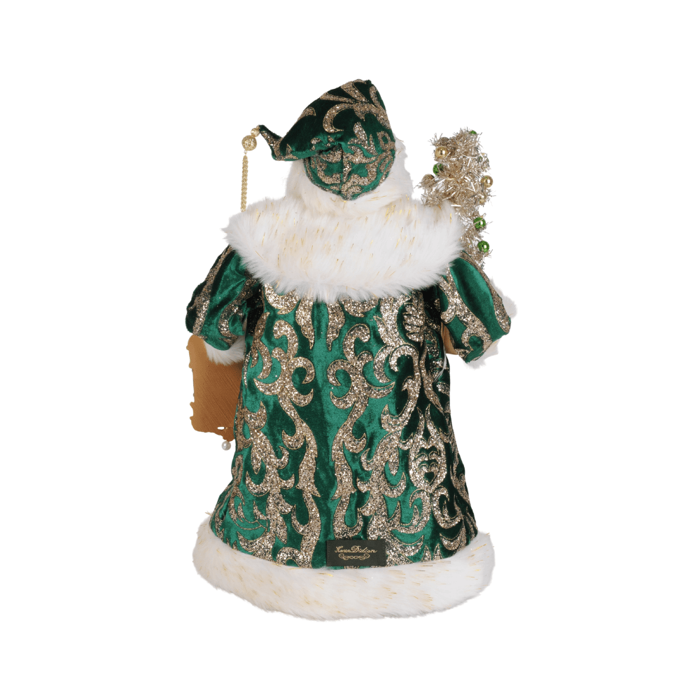 Infuse your home with festive luxury and timeless charm with the Jade Elegance Santa figurine. Dressed in rich green velvet and accented with dazzling gold embellishments, this Santa exudes classic elegance with a touch of holiday magic. This stunning collectible features Santa holding a shimmering tinsel tree adorned with green and gold ornaments in one hand, and a beautifully framed sign that reads “Believe in the Magic of Christmas” in the other. His outfit is a masterpiece—layered with sequined scroll embroidery, faux fur trim, and bejeweled accents that catch the light and the imagination. The Jade Elegance Santa is the perfect showpiece for any mantle, entryway, or holiday vignette. A must-have for collectors and anyone seeking to elevate their holiday decor with regal warmth and sparkle.