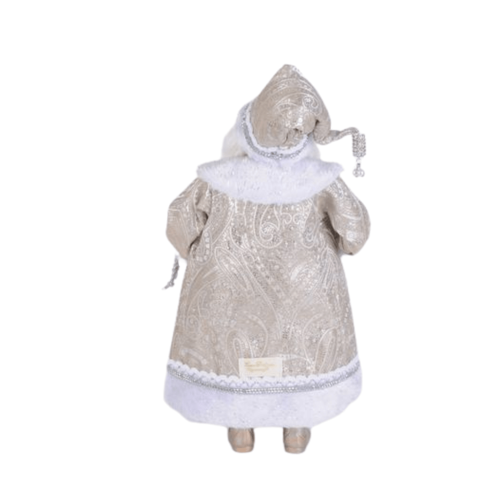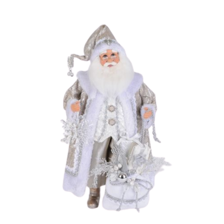 Bring the serene elegance of a snowy Christmas morning into your home with the enchanting Lighted White Christmas Santa figurine. Cloaked in glistening silver and trimmed in soft, snowy white faux fur, this dazzling Santa is a sophisticated statement piece perfect for modern or traditional holiday décor. His shimmering robe features intricate silver embroidery and sequin embellishments, while his white vest sparkles with ornate crystal-like buttons. In one hand, Santa holds a radiant clear snowflake; in the other, a beautifully adorned gift sack overflowing with pearlescent ornaments, silvery presents, glittered branches, and icy foliage. Perfect for winter wonderland themes or luxe holiday displays, the Lighted White Christmas Santa will bring a touch of Arctic magic and refined holiday glamour to your mantel, centerpiece, or collector’s shelf. Takes 2 AA batteries.