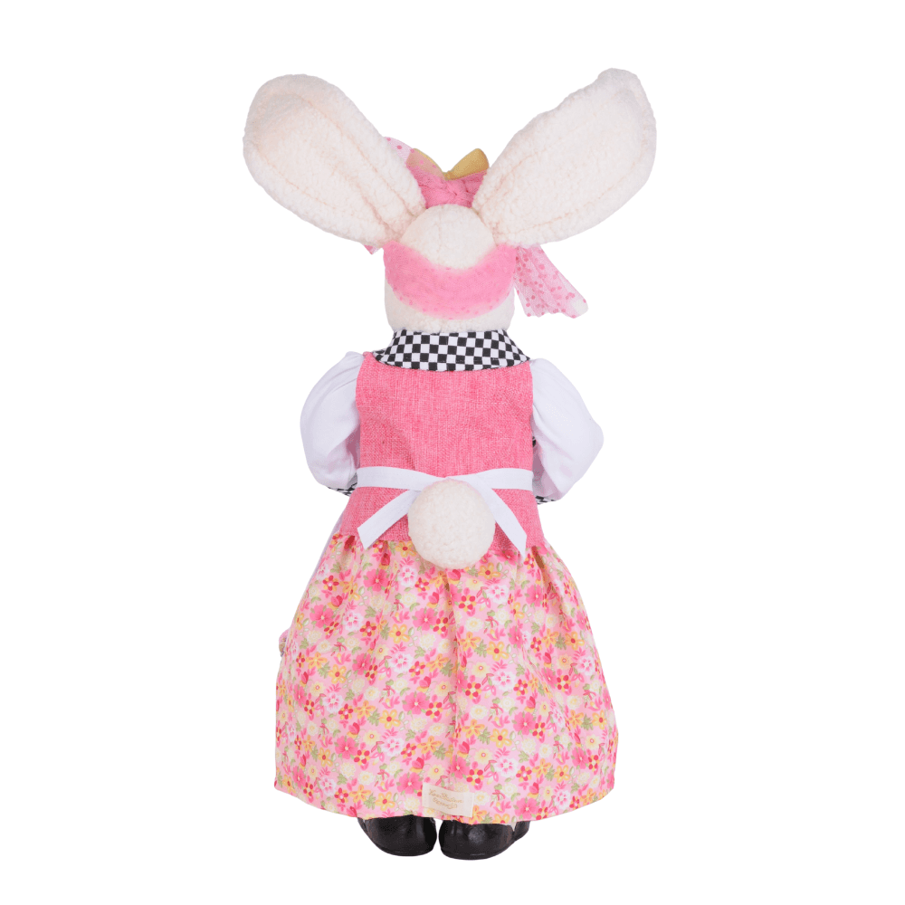 Mona Bunny is a heartwarming addition to your spring collection. This collectible includes a beautiful soft-fluffy exterior and gorgeous country-chic spring dress accented with checkered hues, complete with lace embellishments and trim. She is adorned with her adorable laced headband and basket full of eggs. Her unique design and charming personality will add character and style to any home.