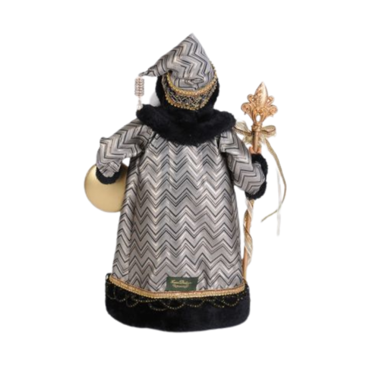 Elevate your holiday décor with timeless sophistication through the Silver and Gold Noel Santa figurine. Dressed in striking black, gold, and silver hues, this stately Santa exudes refined glamour and classic charm—perfect for upscale Christmas themes and collector displays. Santa is adorned in a luxurious chevron-patterned robe trimmed in plush black faux fur and lined with dazzling golden embellishments. His attire glistens with metallic textures and intricate beadwork, showcasing the craftsmanship of a holiday heirloom. In one hand, he holds a golden staff topped with an ornate fleur-de-lis and delicate ribbon, while the other carries a large gold ornament inscribed with the word “Noel,” symbolizing the spirit of Christmas. The Silver and Gold Noel Santa brings a sense of majesty and luxury to your holiday décor. Whether displayed on a mantel, entry table, or as part of a curated Christmas scene, this stunning figurine is sure to captivate and impress for years to come.