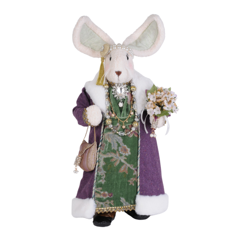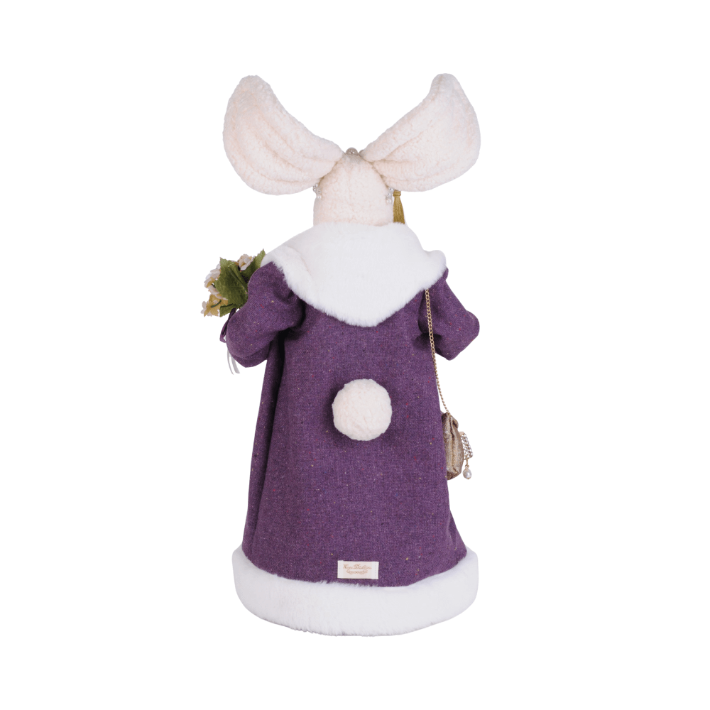 Violet Bunny is a heartwarming addition to your spring collection. With this collectible's soft-fluffy exterior, elaborate Victorian attire styled with a violet floor length coat accented with beads and jewels; she's created full of personality and will add character and style to any home.