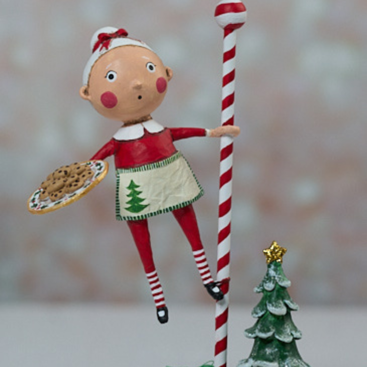 Mrs Claus is so happy, she's spinning around the North Pole! That's a candy cane striped pole, of course. With her freshly baked cookies, she is celebrating the joy of the season. The wrapped presents at the foot of the pole remind us of the greatest gift of all - the spirit of Christmas. Display this one with all of your other favorite Lori Mitchell Christmas figures.