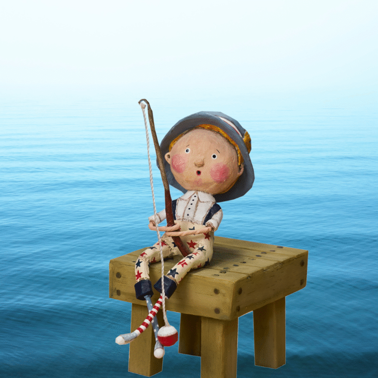 Sittin' on the dock of the bay, this little guy is so happy summer is here, school is out and he is at the lake with his family for a vacation filled with fishing and swimming! Casually sitting in pants covered with red and blue stars, suspenders and fishing hat, he is getting ready to throw his line into the water and catch the big one! Dinner will be on him, he can feel it! Like most of Lori Mitchell's figures, he is wearing mis-matched socks! A fabulous Lori Mitchell figure to pair with all of the beach themed designs!