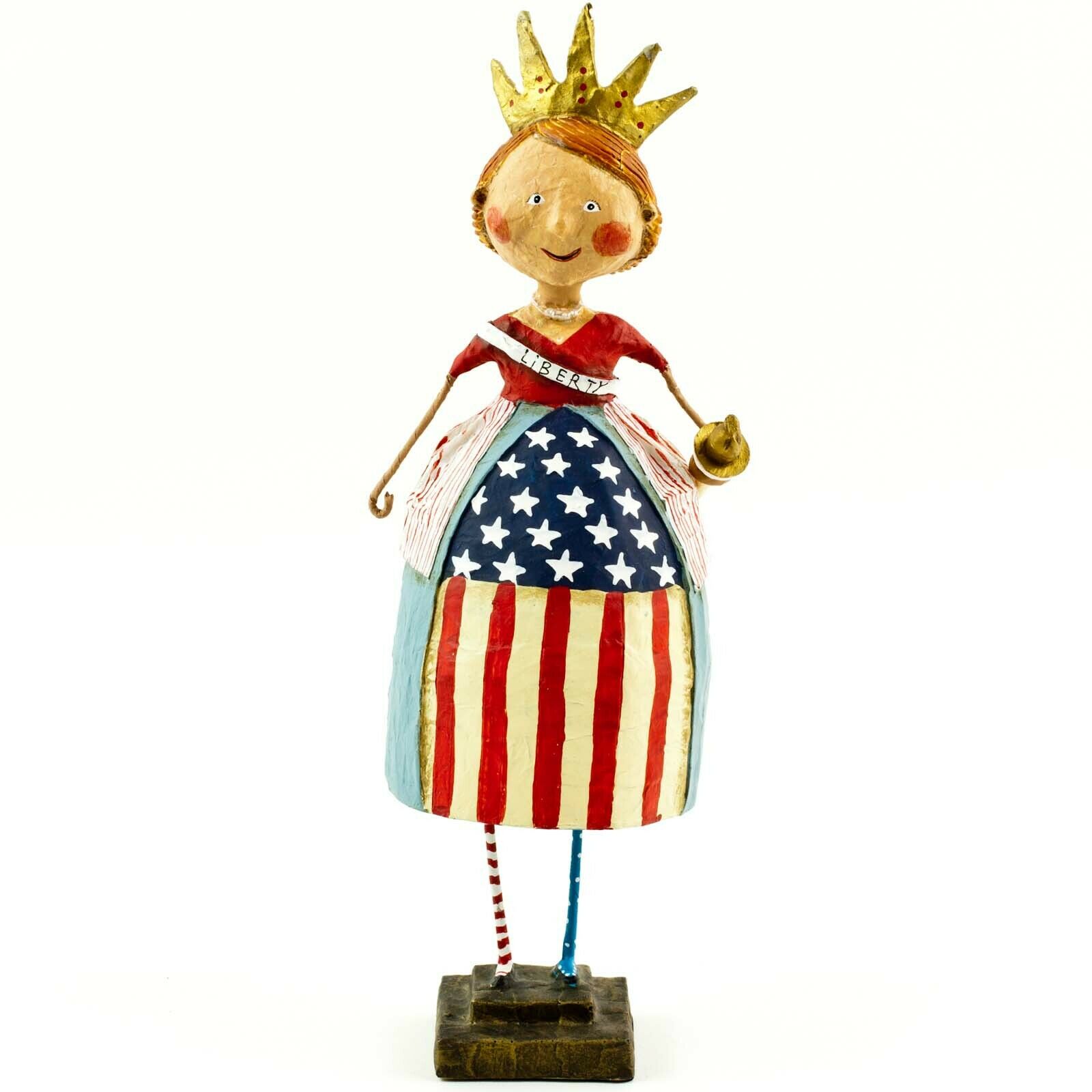 This majestic lady liberty wears a stars and stripes dress, holds a torch, and wears a ribbon reading Liberty. Cute and unique patriotic decor, she's a folk art tribute to the red, white and blue!