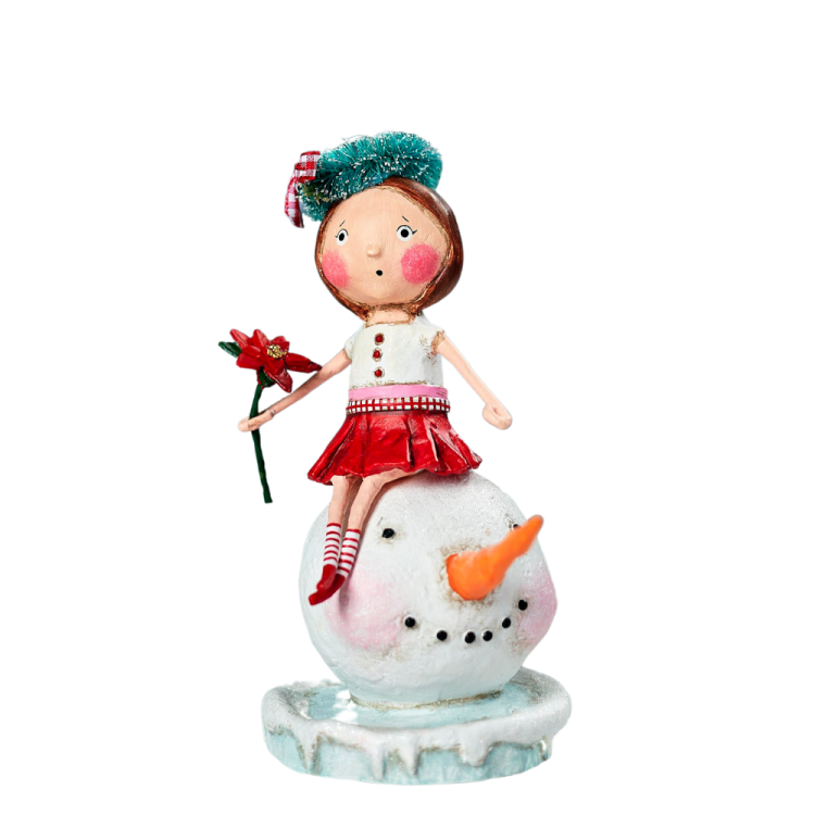 Delightfully dainty, this sweet little girl perches atop a jolly snowman. She is enchanting in her red skirt, wearing a festive wreath on her head and holding a bright poinsettia. Merry and Bright will pair perfectly with the rest of the Lori Mitchell Christmas Collection.