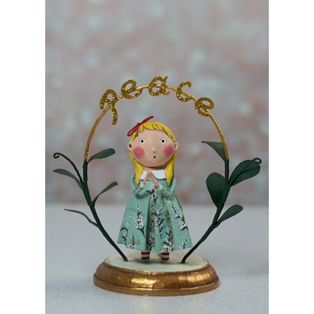 Such a lovely figurine depicting a young girl on her knees, hands clasped, praying for peace. She kneels below an arch with the word PEACE on it. This figure inspires us all to reflect on the possibility of peace and pray for it. Truly represents the spirit of Christmas! Display this figure with all of your other favorite Lori Mitchell Christmas figurines.