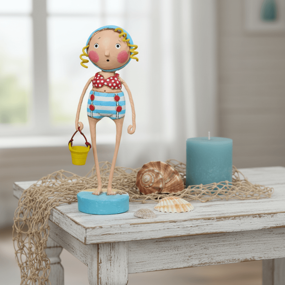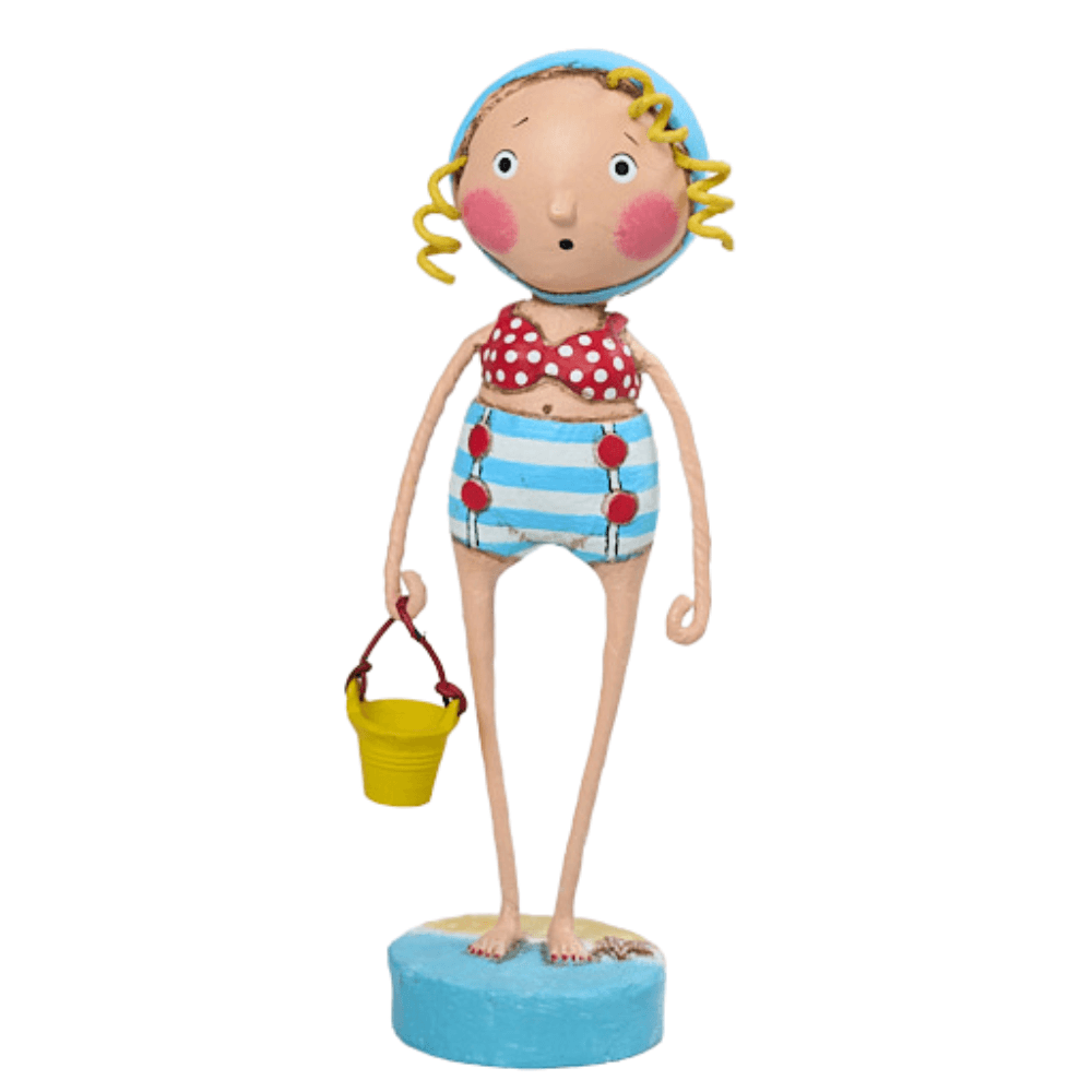 The beach is calling, and this adorable little girl is ready for adventure! Dressed in her swimsuit and matching cap, she’s all set for a day of seaside fun—whether that means splashing in the waves or searching the shore for the perfect shells. With her playful spirit, she’s ready to make the most of a sunny day by the sea. This figure pairs well with other Lori Mitchell Spring and Summer characters, so have fun assembling your own summertime display!