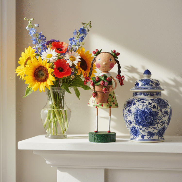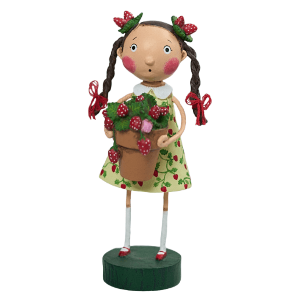 This sweet little girl is ready for a sunny day in the strawberry patch! Holding her clay pot filled with bright strawberry plants, she’s dressed for the occasion in a cheerful yellow summer dress sprinkled with strawberries. Her adorable braids are topped with tiny strawberry clips that complete her berry-cute look. This charming figure brings back the simple joys of summertime—warm sunshine, fresh berries, and carefree days in the garden. This figure pairs well with other Lori Mitchell Spring and Summer characters, so have fun assembling your own summertime display!