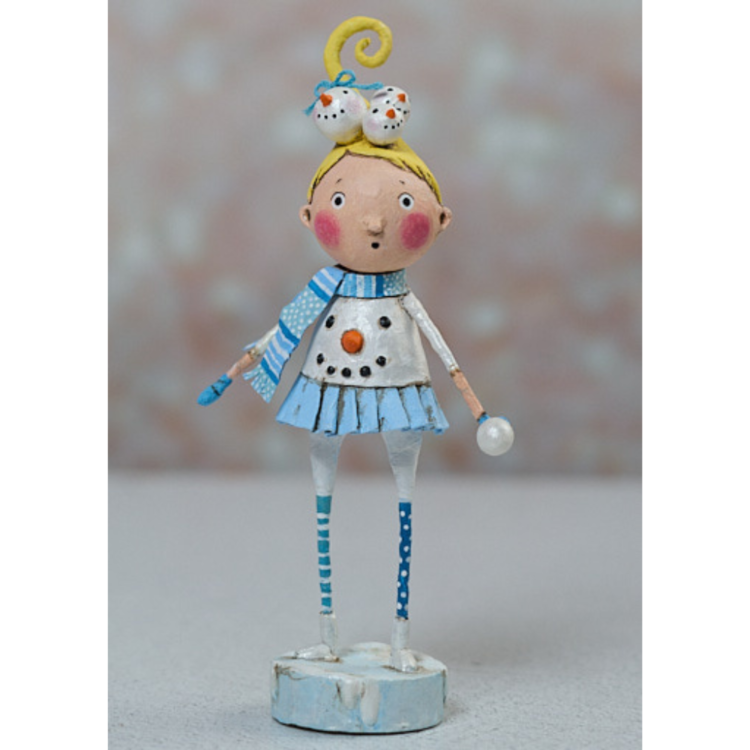 Susie's holiday outfit rises to a new level of cool chic. She sports a snowman sweater layered over a pleated blue skirt, and she amps up her style with snowball accents to her hair. Look out for the snowball she is about to throw your way! She is a fun addition to the Lori Mitchell Christmas Collection and pairs especially well with little Jack Frost.