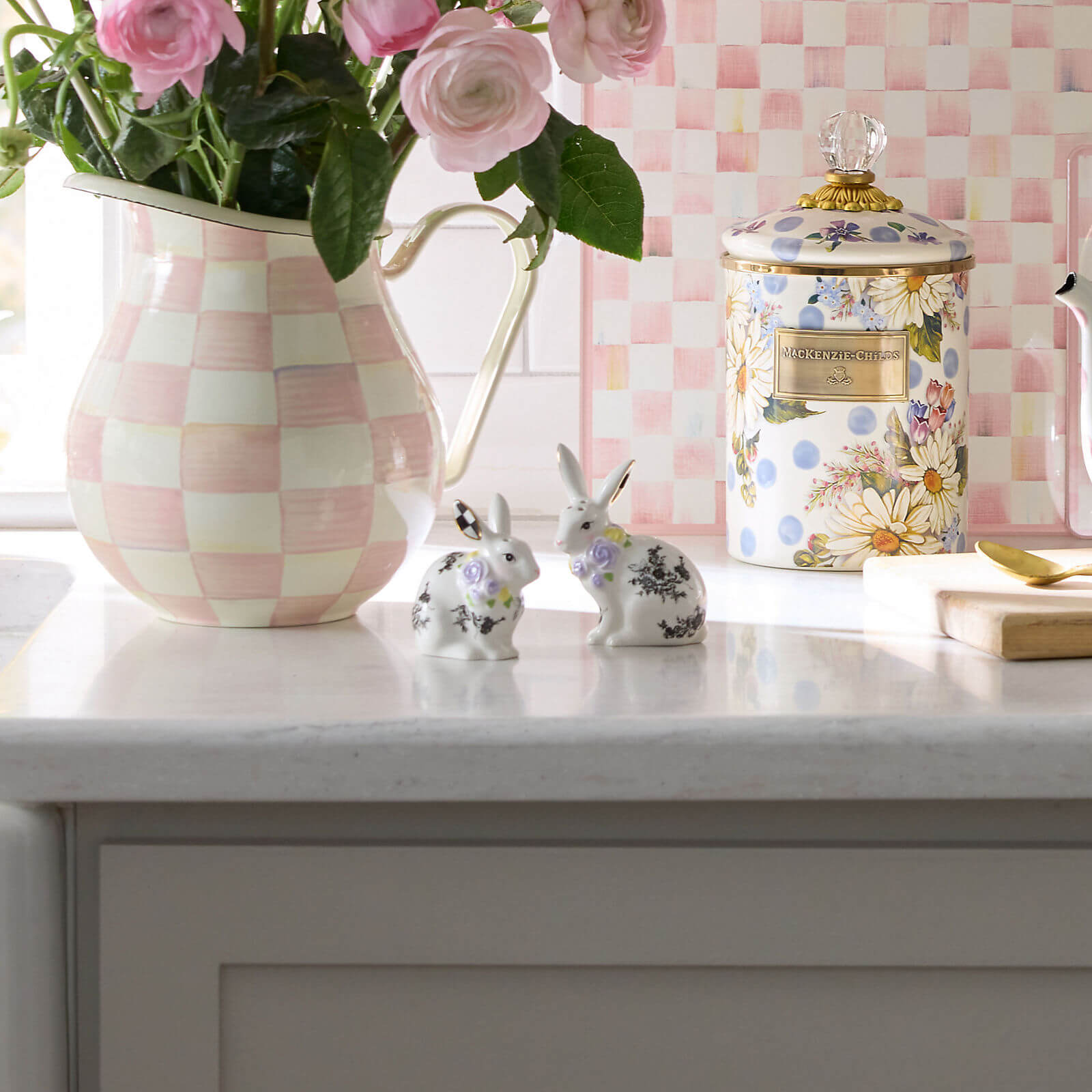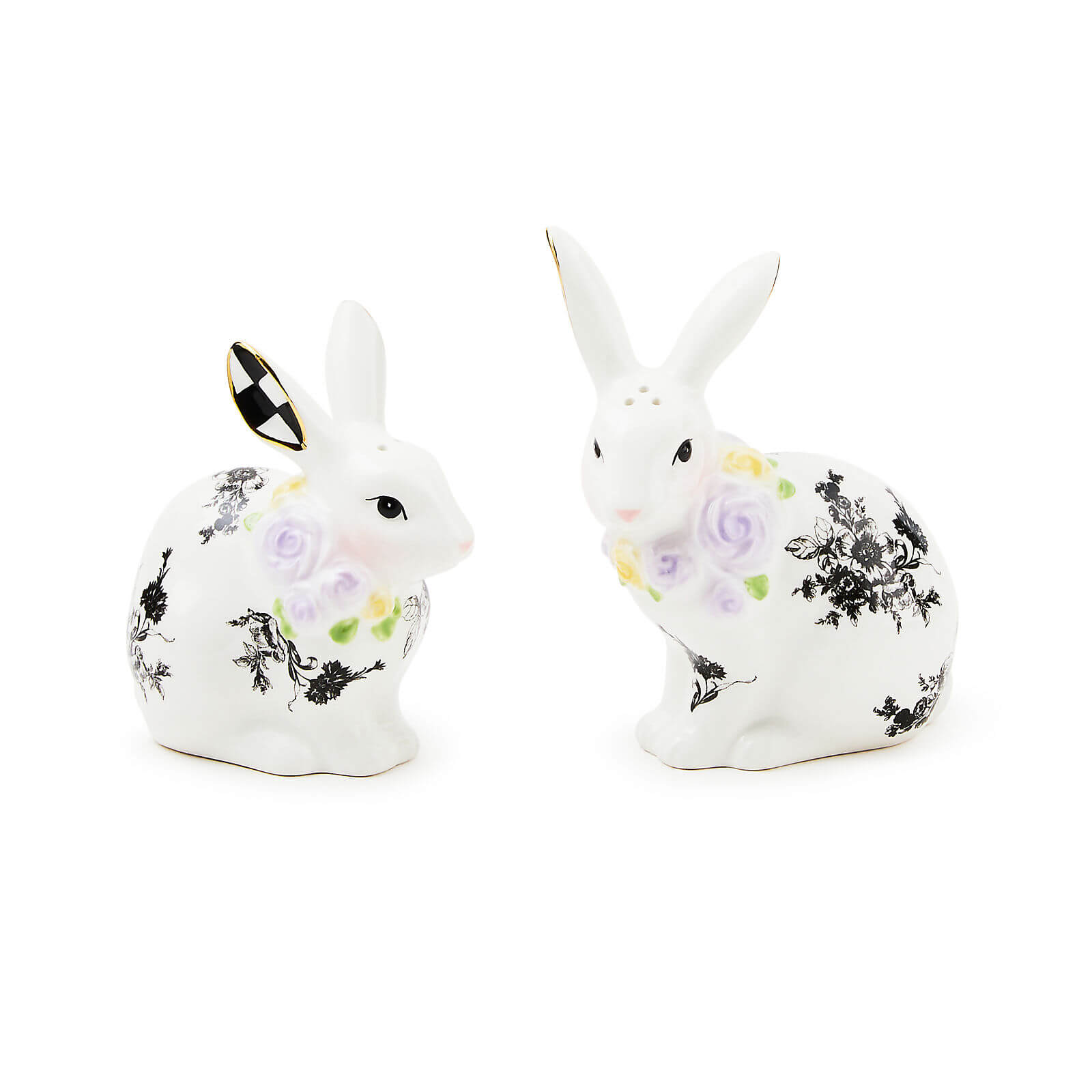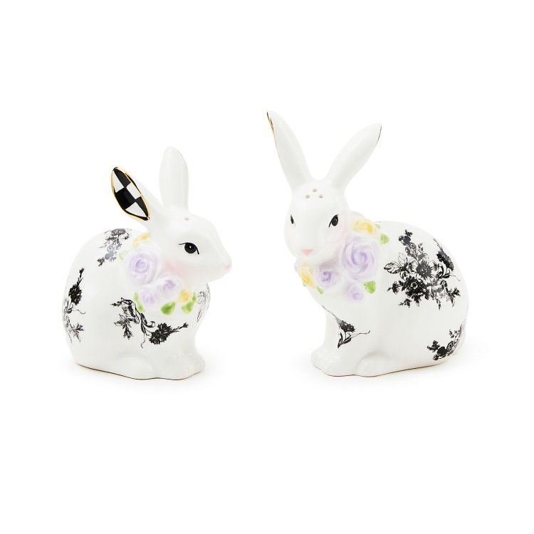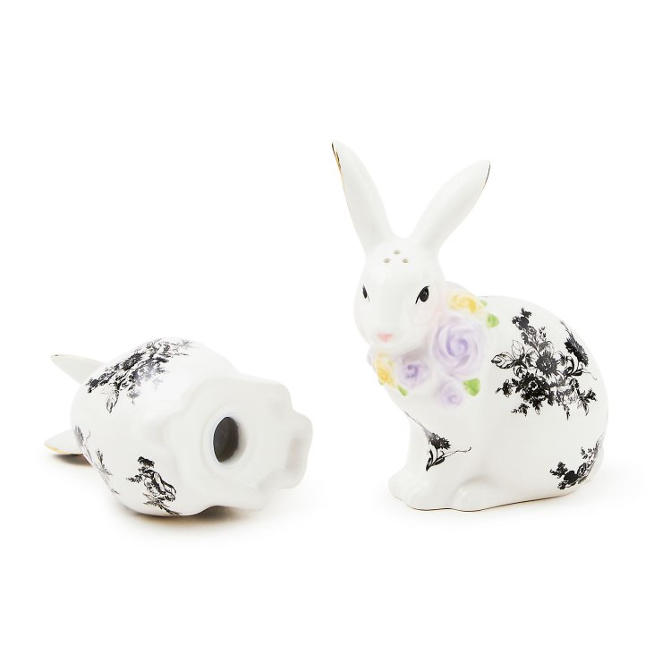 Set the scene for celebration with this white ceramic salt and pepper set that features bunnies accented with hand-applied floral transfers and hand-painted check ears. Presented in a beautiful gift box, this set makes an ideal gift for the salt and pepper shaker collector, who might also happen to be your favorite host.