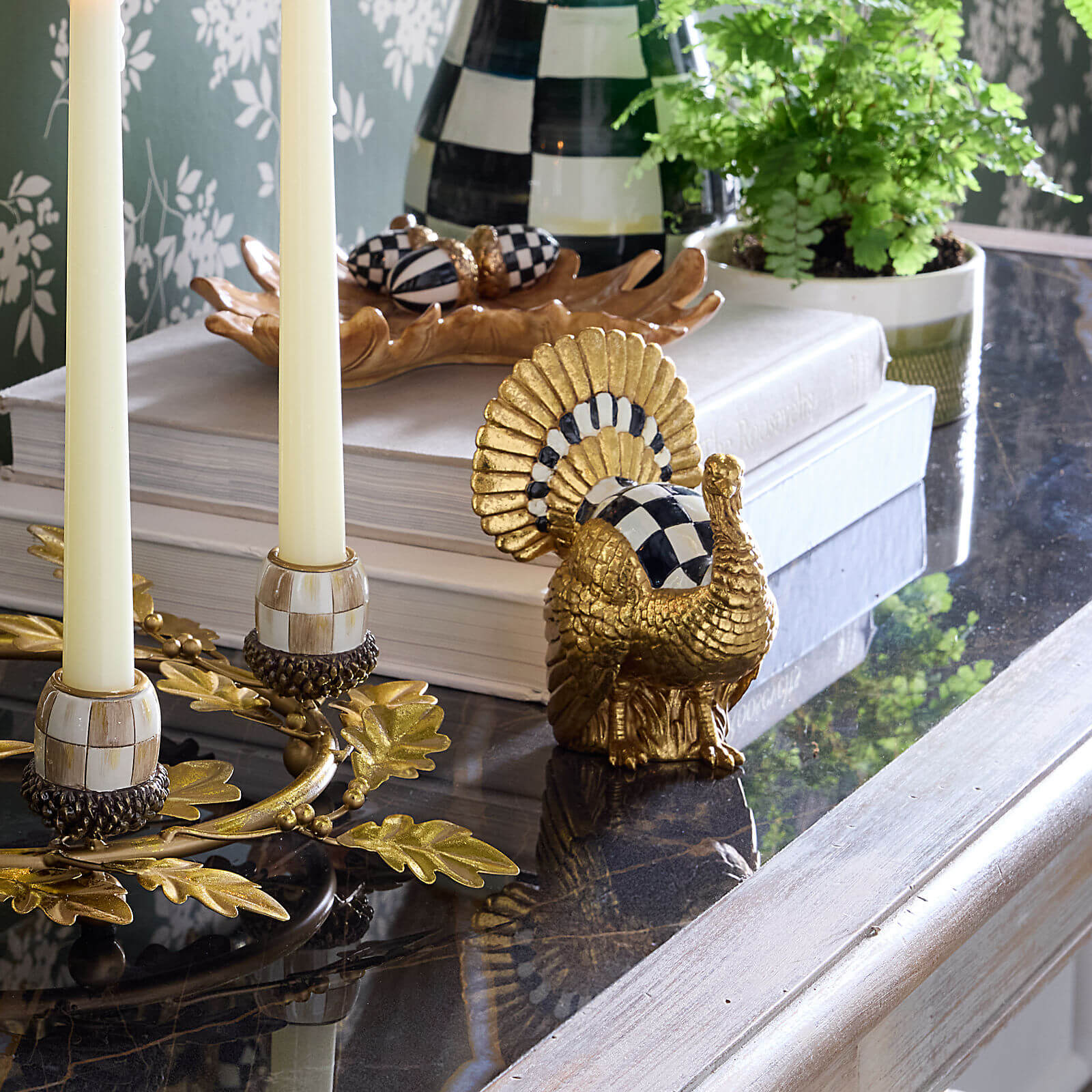 Let’s talk turkey about the shimmering Courtly Check Mini Gold Turkey Figurine, covered in gold paint and trimmed with Courtly Check.