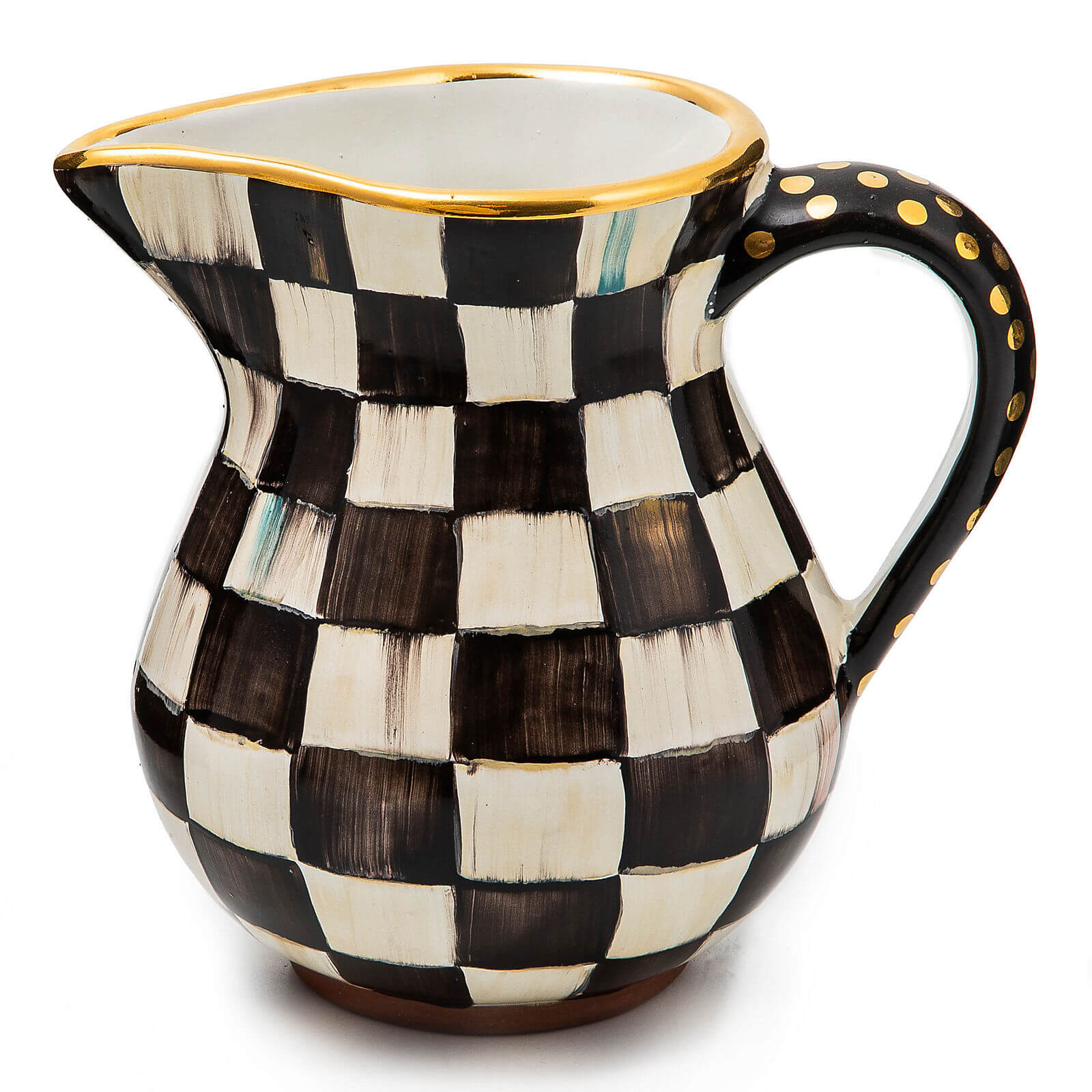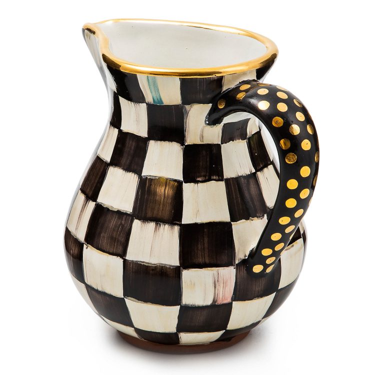 Made start to finish in Aurora, New York, the ceramic Courtly Check® Portly Pitcher is sized just right for holding water, lemonade, or fresh flowers. Hand-painted with our color-dragged, signature check pattern, it’s trimmed with gold lustre dots on the handle.