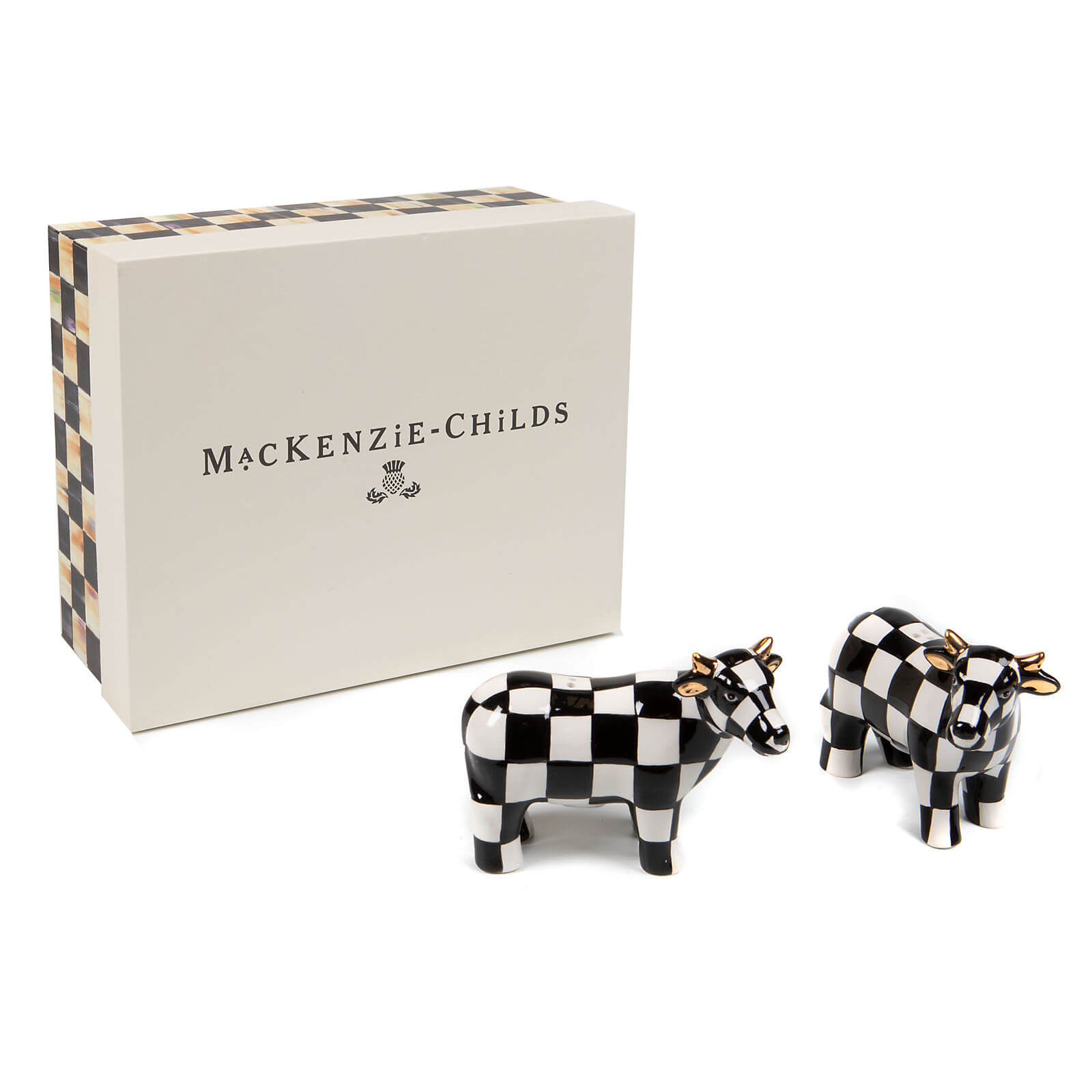 Sure to make your table fresh and fun, the hand-painted ceramic Cow Salt & Pepper Set features a pair of checked cows with gold lustre ears that hold salt and pepper. Presented in a beautiful gift box, it makes an ideal gift for the salt and pepper shaker collector, who might also happen to be your favorite hostess or host.