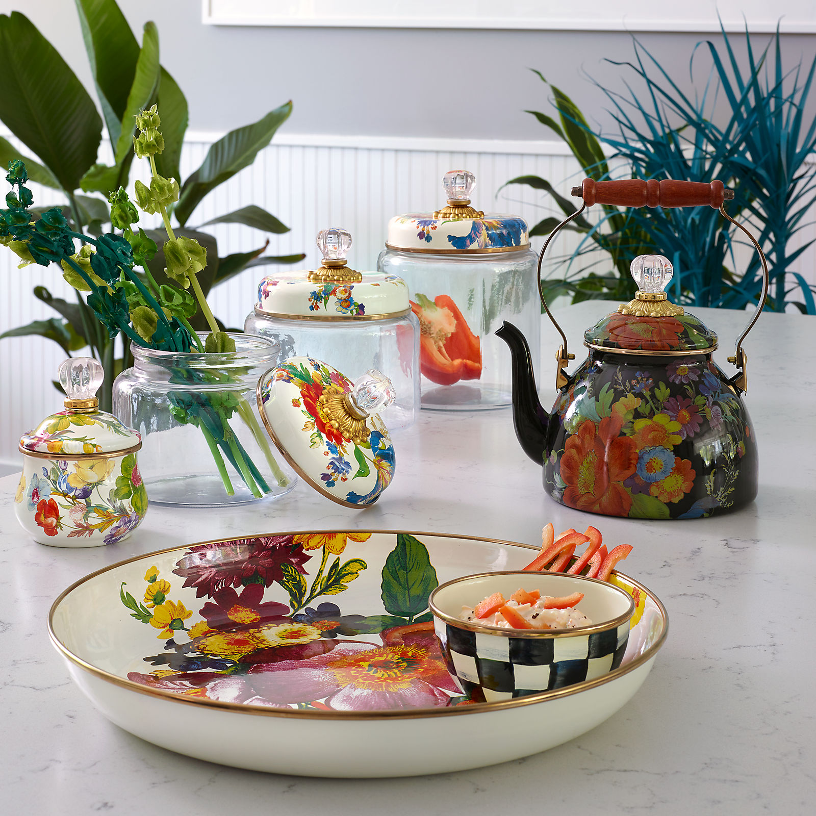 Heavy-gauge, hand-glazed steel underbody with hand-applied floral transfers, rimmed in bronzed stainless steel. Lid is topped with glass and brass accents. Pieces may vary due to the handmade nature of each product. Imported.