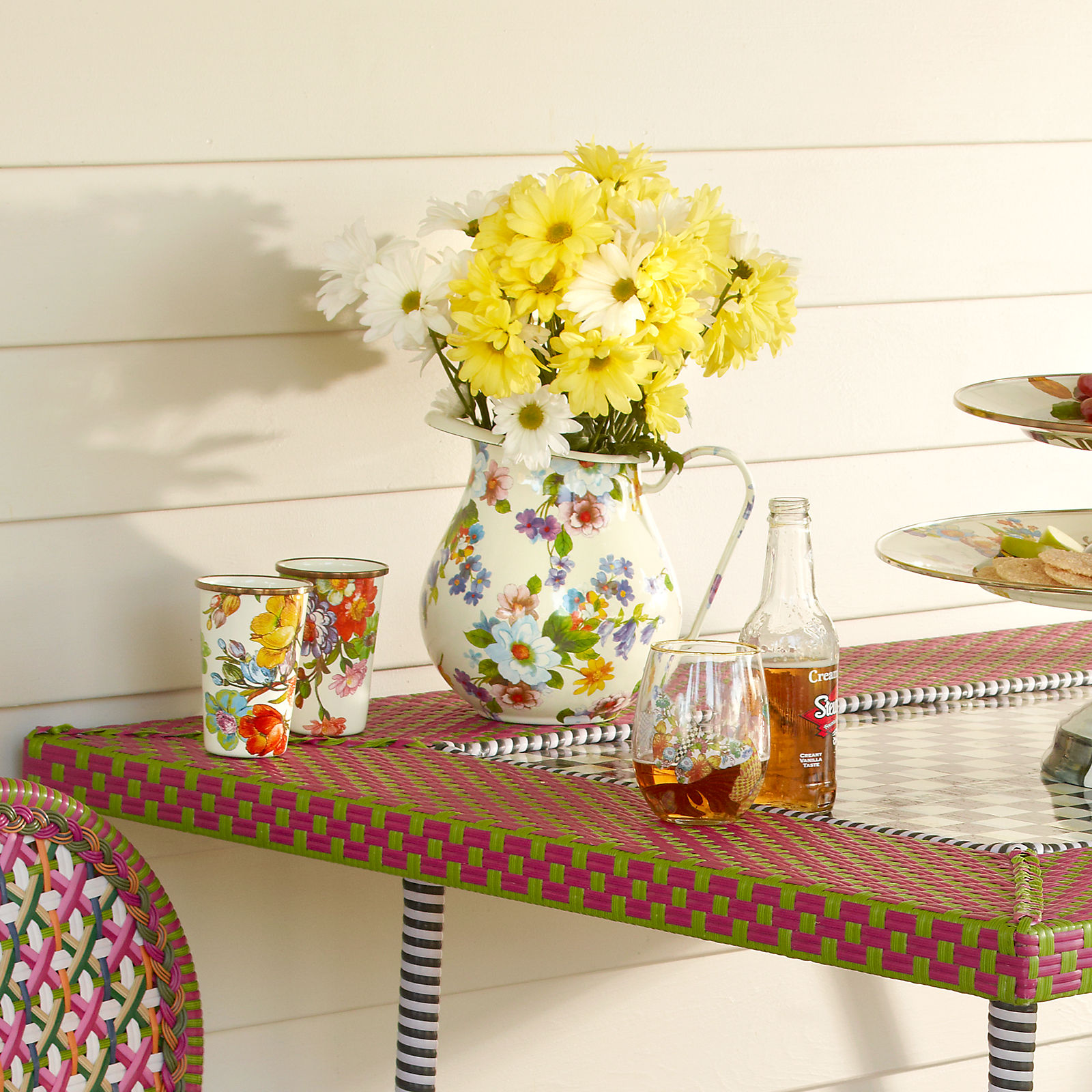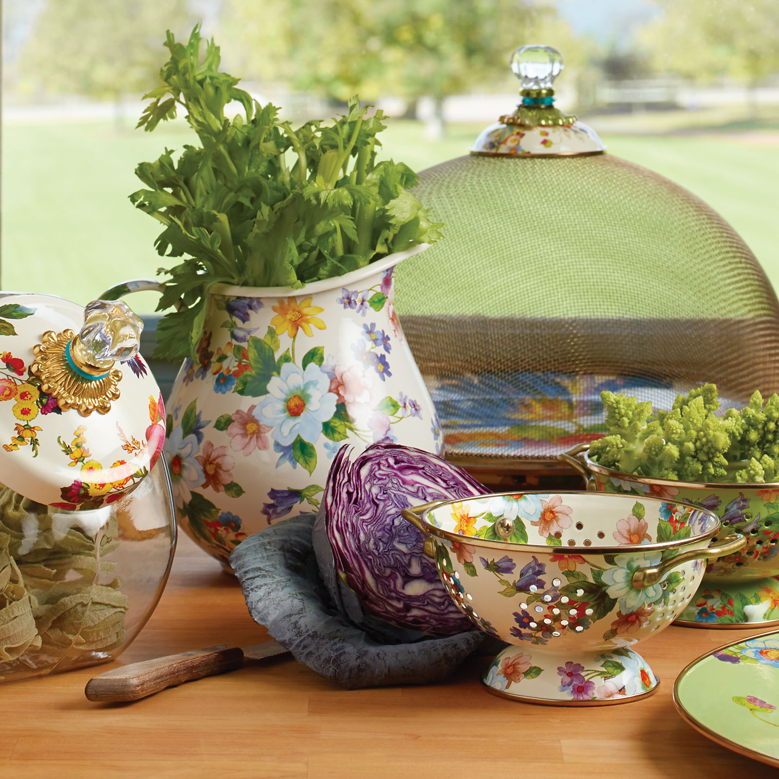 For ice water, fresh-squeezed lemonade or a refreshing punch, our bright and cheerful White Flower Market Pitcher dresses up the bar or dinner table. Makes a great gift paired with a basket of fresh fruit and a bottle of red wine for a stylish sangria, or fill with late-August sunflowers to add a cheerful warmth to your kitchen. Heavy-gauge, hand-glazed steel underbody with hand-applied fanciful botanical transfers that recall a lush English garden.