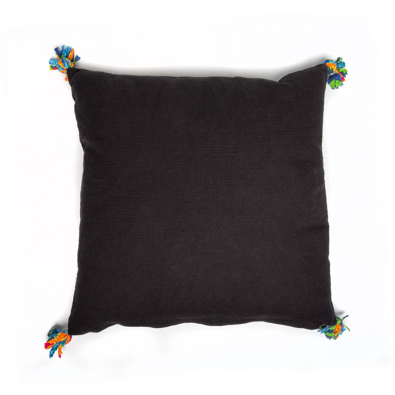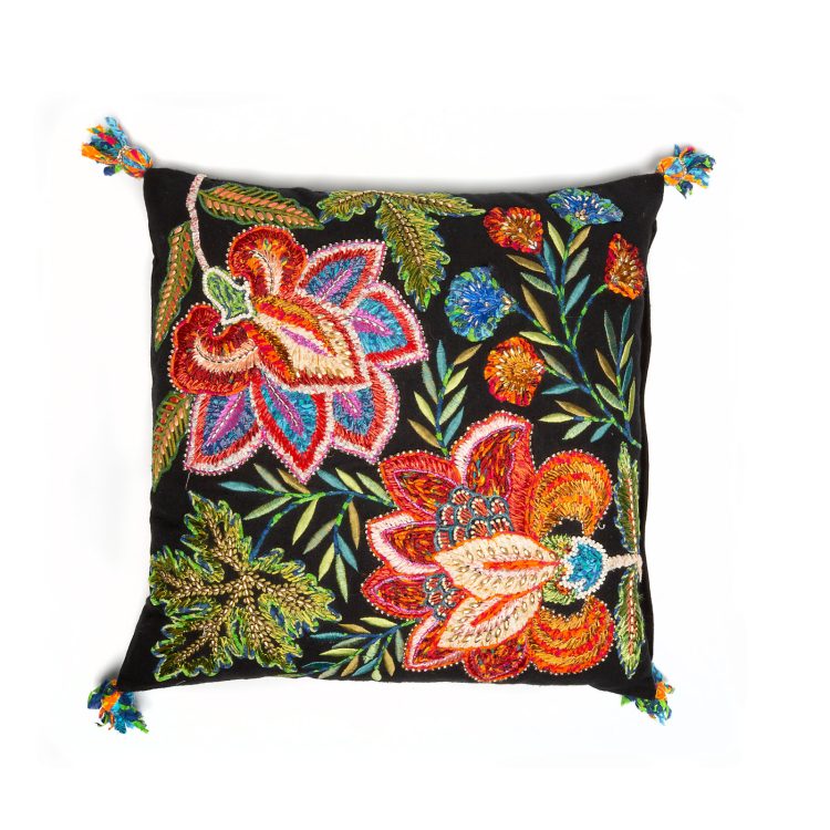 Our Jaipur Pillow blossoms with playful possibilities, featuring a floral bouquet that’s accented with lavish embroidery and beads on a background of black cotton. The finishing touches are multicolored tassels on the four corners.