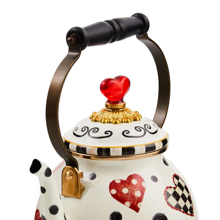 Suit your personali-tea with The Tea Kettle Collective. Have a heart (or two) for our Love 2 Quart Tea Kettle, featuring hearts and polka dots on a heavy-gauge steel underbody, finished with a wood handle and a heart-shaped, red glass knob on the lid. Each special-edition Collective kettle makes a great cup of tea, of course, and adds MacKenzie-Childs style to your stovetop. Don’t be surprised that you need more than one.
