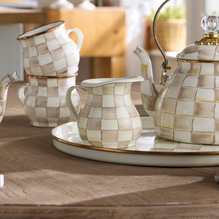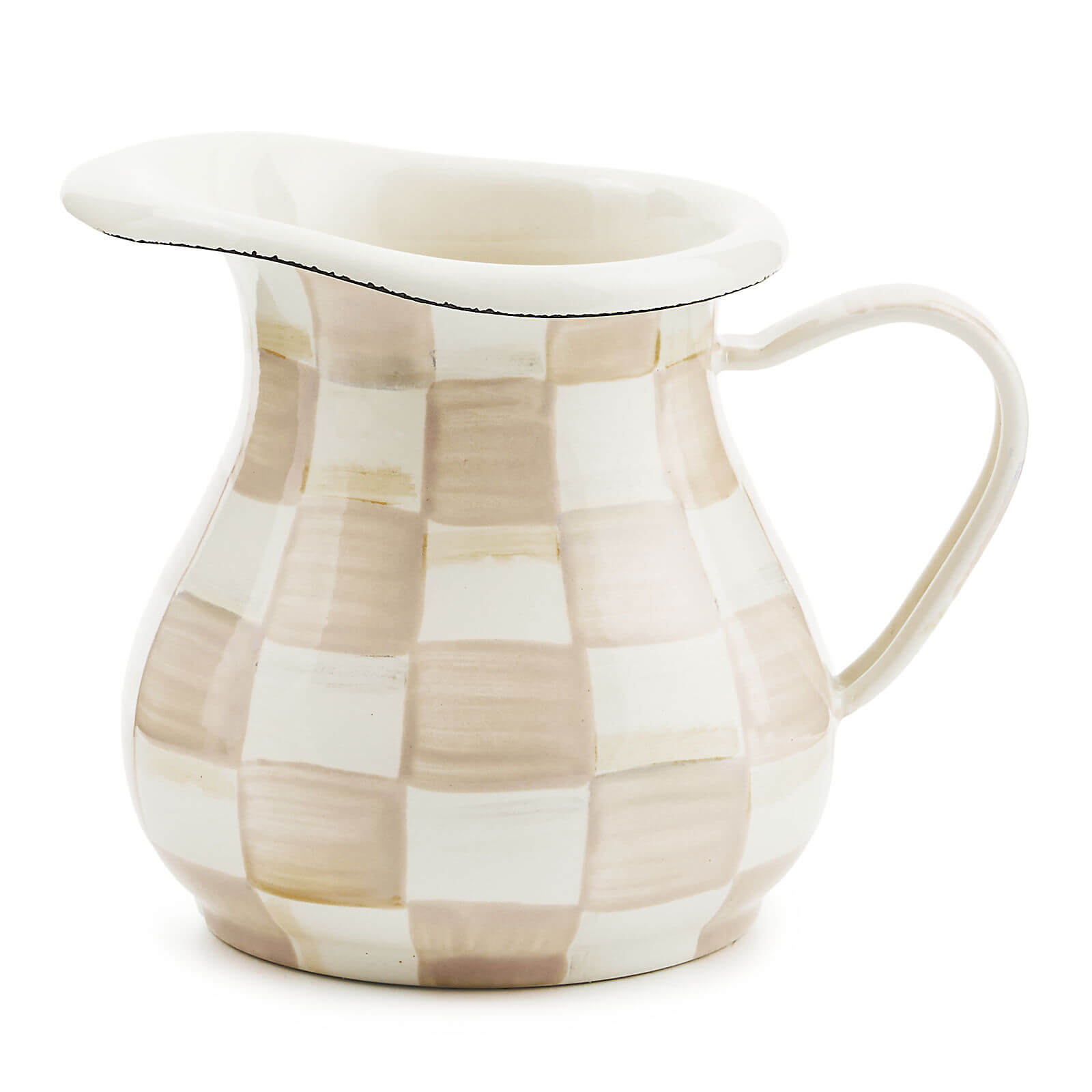 The Mocha Check Creamer is the perfect way to energize your morning cup of joe. Take your coffee black? Don’t fret—this versatile enamel vessel invites countless uses—from hot fudge to spaghetti sauce to homemade herb vinaigrette. The heavy-gauge steel underbody is glazed with hand-painted, coffee-colored checks.